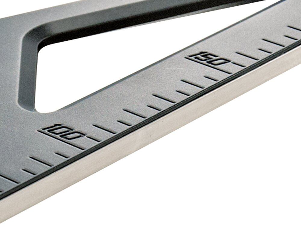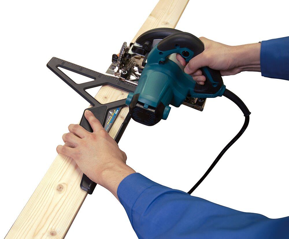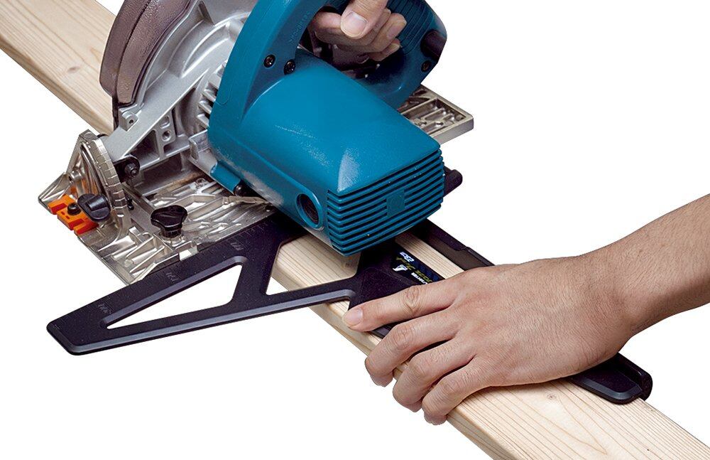 ・ツーバイ材などの面取り材やフロア材などにしっかり突き当てられ、長さも電気丸ノコのモーターを気にせずしっかり固定するスペースを確保