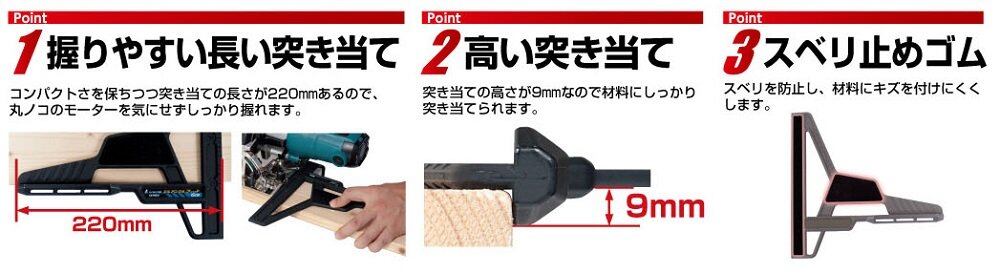 ・コンパクトさを保ちつつ突き当ての長さが220mmあるので、丸ノコのモーターを気にせずしっかり握れる。