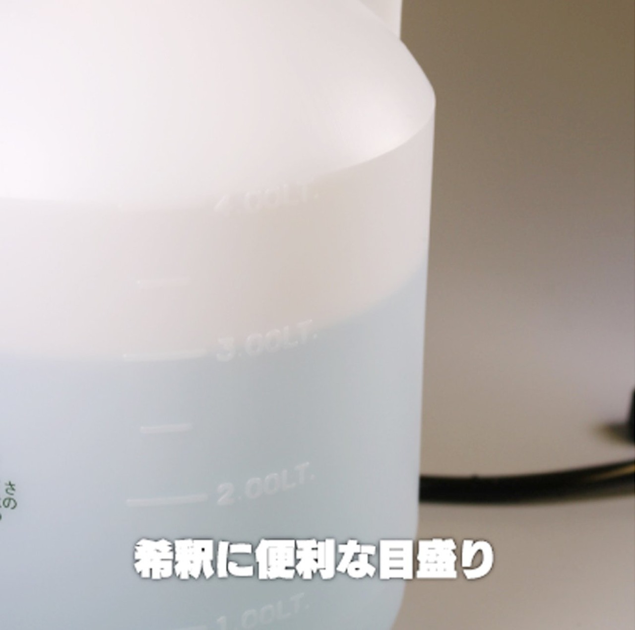 大容量サイズで広範囲の噴霧が可能。ロングノズルが付いて姿勢ラクラク!