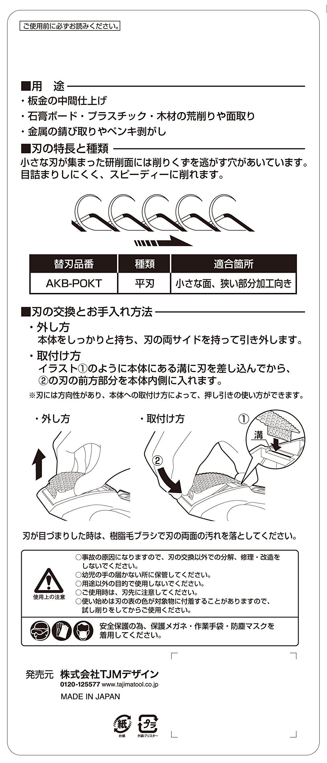 品番:AK-POKT JAN:4975364050908 製品重量(g):53 税込価格(円):1,408 税抜価格(円):1,280 品番:AK-POKT 税込価格(円):1,408 税抜価格(円):1,280 用途:小さな面、狭い部分加工向き 刃:スチール 本体:ABS樹脂