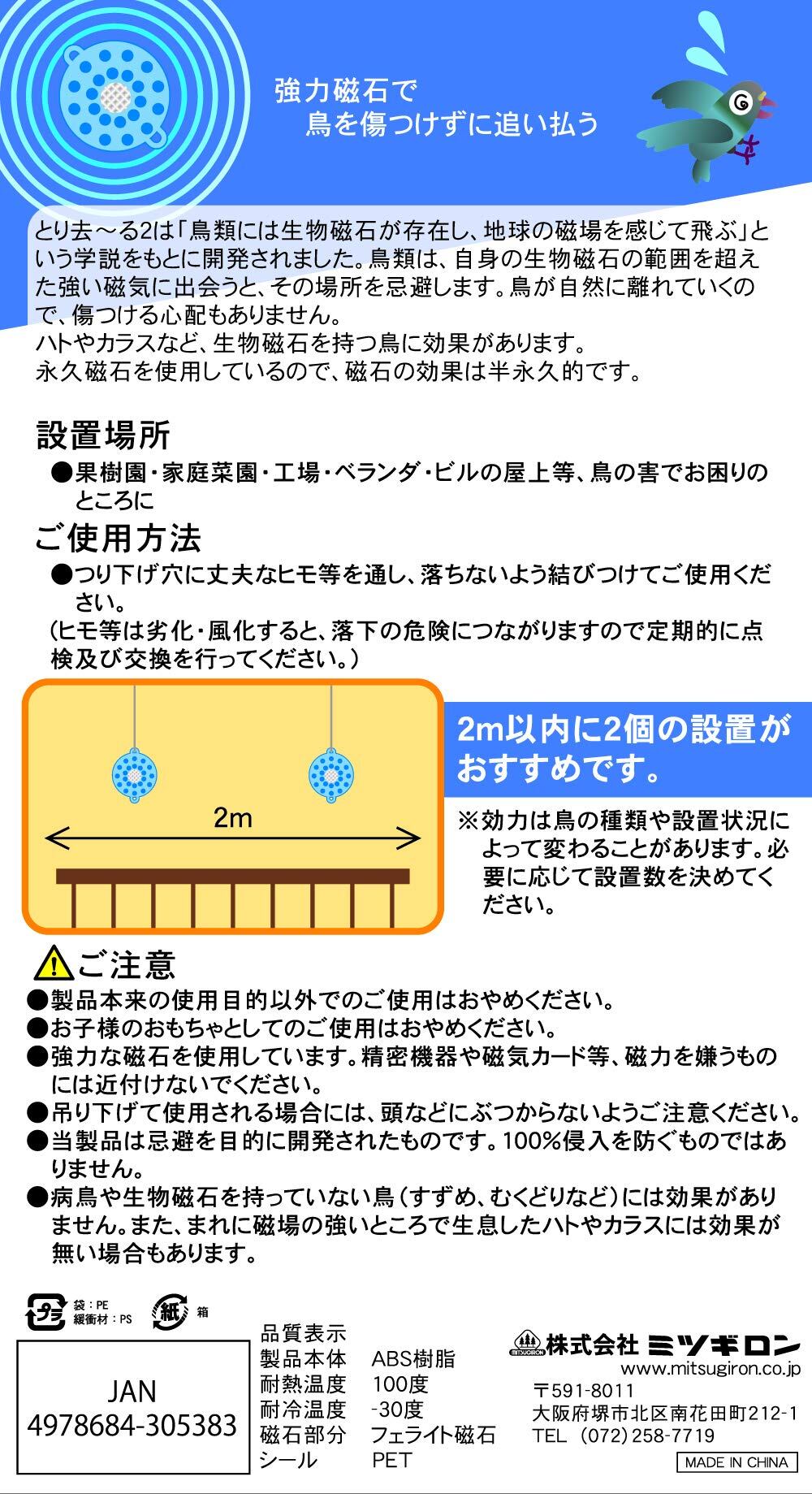 ・当製品は忌避を目的に開発されたものです。100%進入を防ぐものではありません。また、まれに磁場の強いところで生息したハトやカラスには効果がない場合もあります。