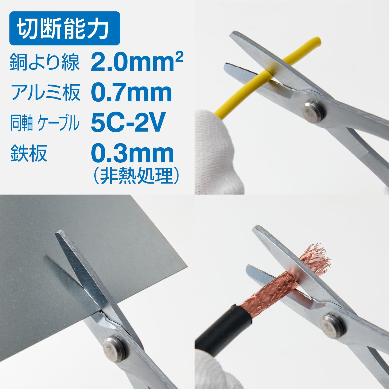 ・【切断能力】銅より線:2.0mm^2、アルミ板:0.7mm、同軸ケーブル:5C-2V、鉄板:0.3mm(非熱処理)【硬度HRC】刃部:59【重量】60g【用途】電気工事、配線工事、電子工作、機械修理、自転車修理、工作、洋裁、園芸