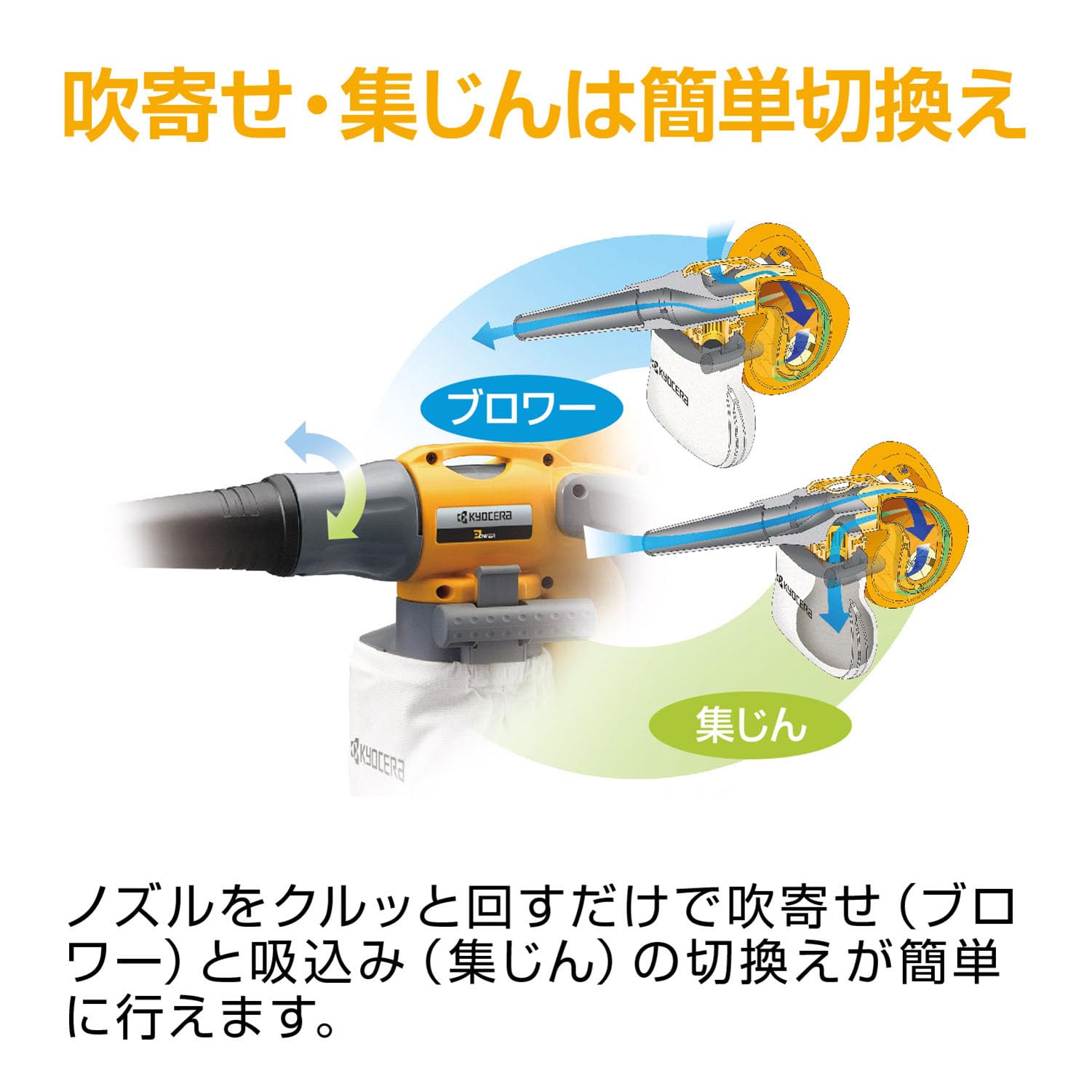 特徴:ノズルを回転させてブロワと集じんをワンタッチで切換えできる