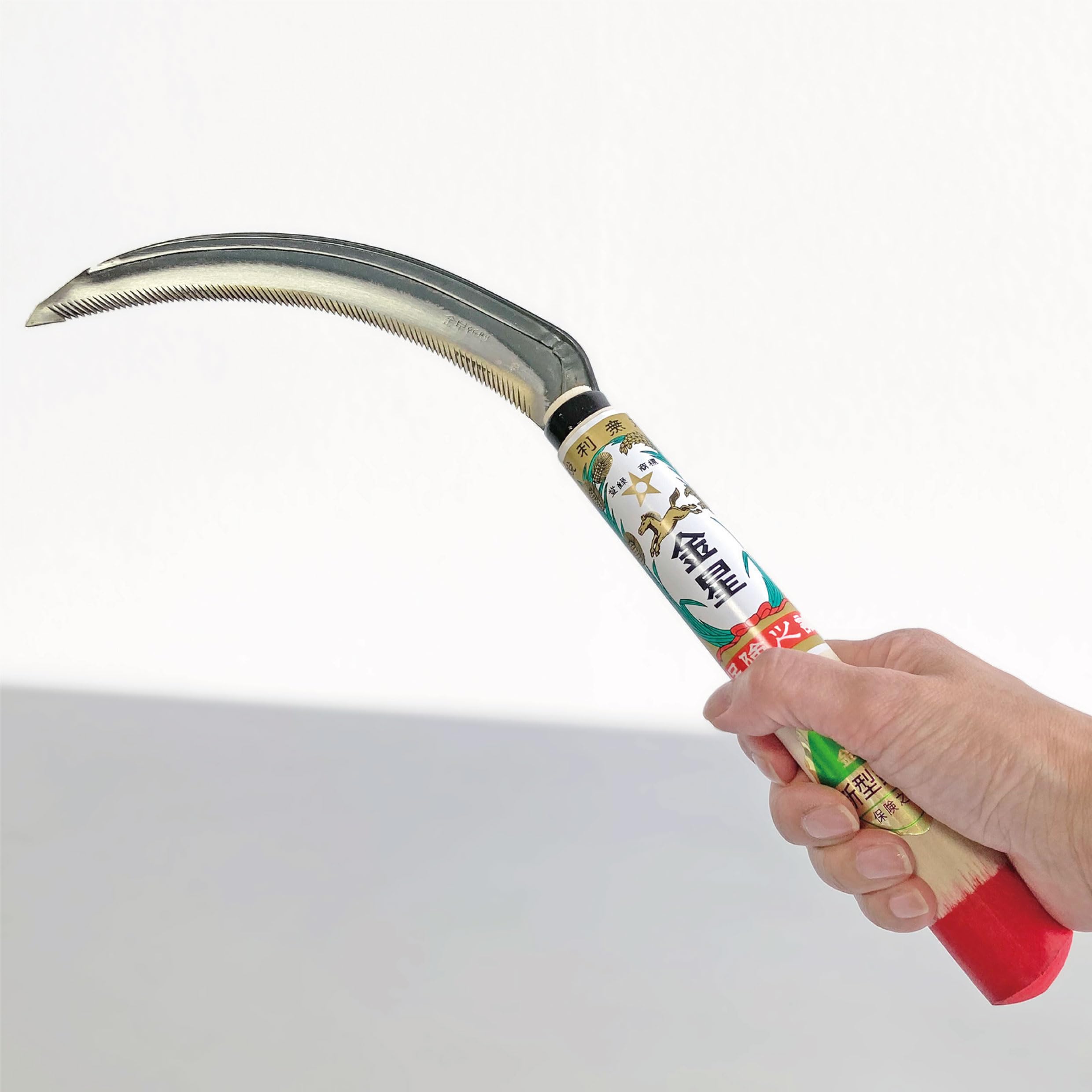 強度と粘り強さを持った鋼を使用しており、たしかな切れ味を実現しています。主として稲刈りに・草刈り等に最適な鋸鎌です。
