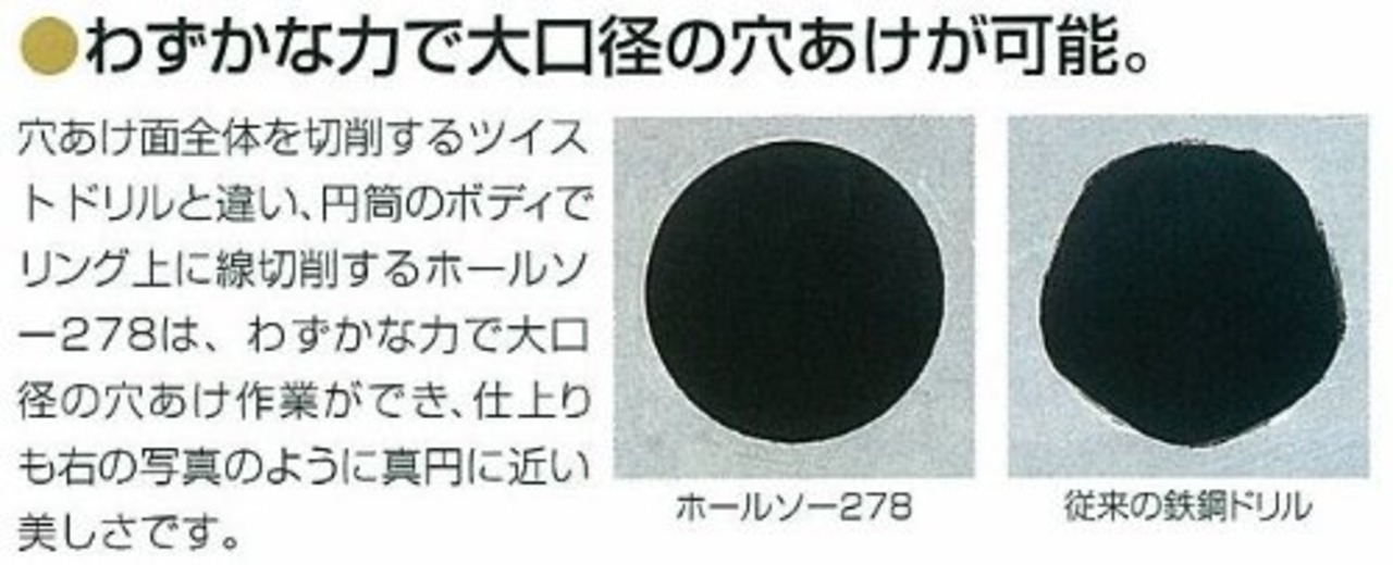 ハイス刃に比べて、高回転の電動機が使用でき、スピーディな穴あけができます。