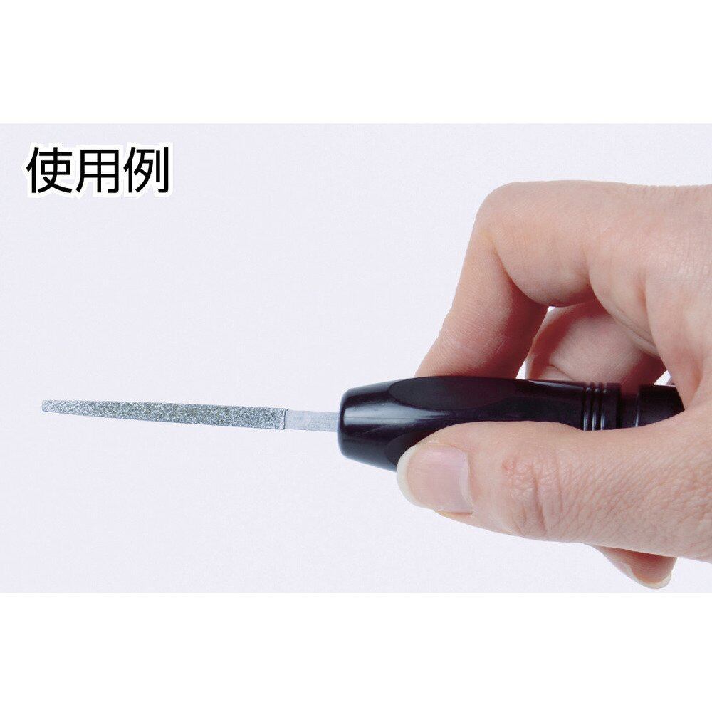 ●柄は3Φの丸軸です●硬質物の研削・研磨加工に最適。●小径穴・面取り・研削・芯研磨・仕上げ研磨など。●特に細かい作業に。●細い箇所に最適なショートタイプです。●別売のハンドル(T-HANDLE)もしくはレシプロのハンドグラインダーに装着して使用する事ができます。●スイスのバローべ社の台金を使用した最高品質のダイヤヤスリです。●ヤスリ台金:寸法精度が高く、適度なしなりがあります。●ダイヤモンド:特注のダイヤモンドは耐摩耗性と研削力に優れています。●コーティング:均一であるため保持力が強く、脱粒しにくいです。