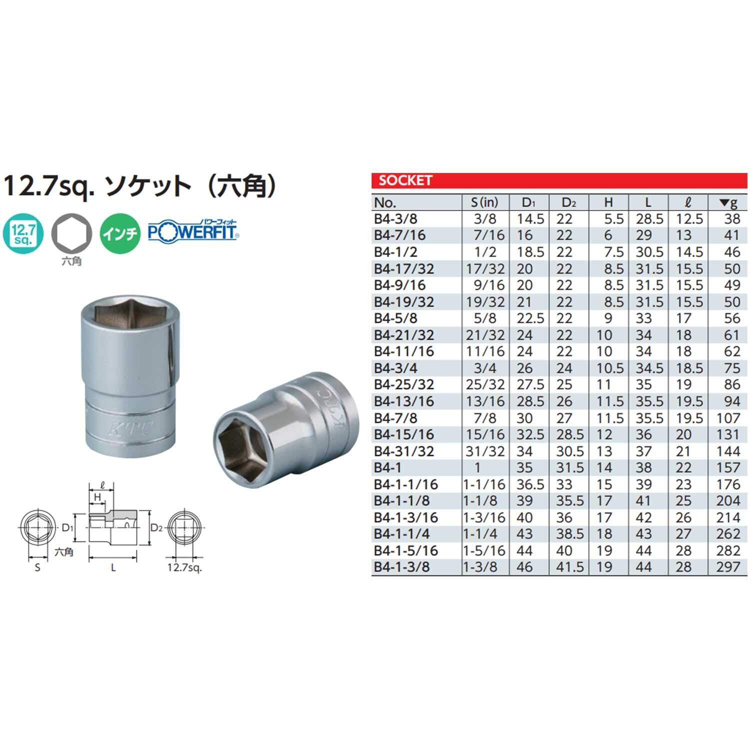 京都機械工具(KTC) 12.7mm (1/2インチ) ソケット (六角) B4-1/2
