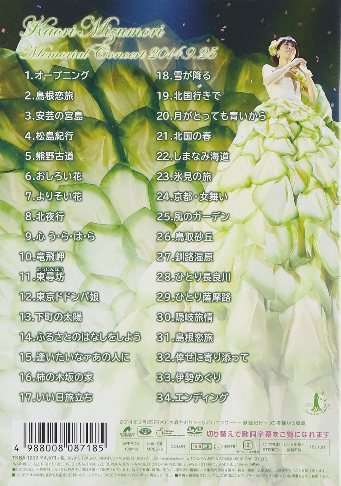 デビュー記念日として2014年9月25日開催されたコンサート「水森かおりメモリアルコンサート~歌謡紀行~」(@中野サンプラザ)の模様を完全収録したDVD商品です。最新シングル「島根恋旅」を始め、最新アルバム『歌謡紀行13~島根恋旅~』に収録されている、オリジナル曲やカバー曲、さらにはデビュー曲「おしろい花」紅白歌合戦で披露したあの巨大衣装での歌唱等々、20周年を迎える水森かおりにふさわしい、豪華絢爛、見どころ満載となっております。