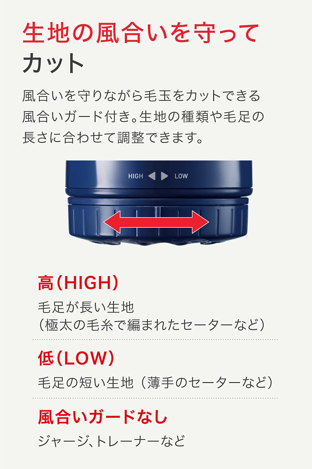 生地の風合いを守りながら毛玉をカット。ニットやジャージなど、生地の種類や毛足の長さに合わせて、高(HIGH)~低(LOW)まで調整可能