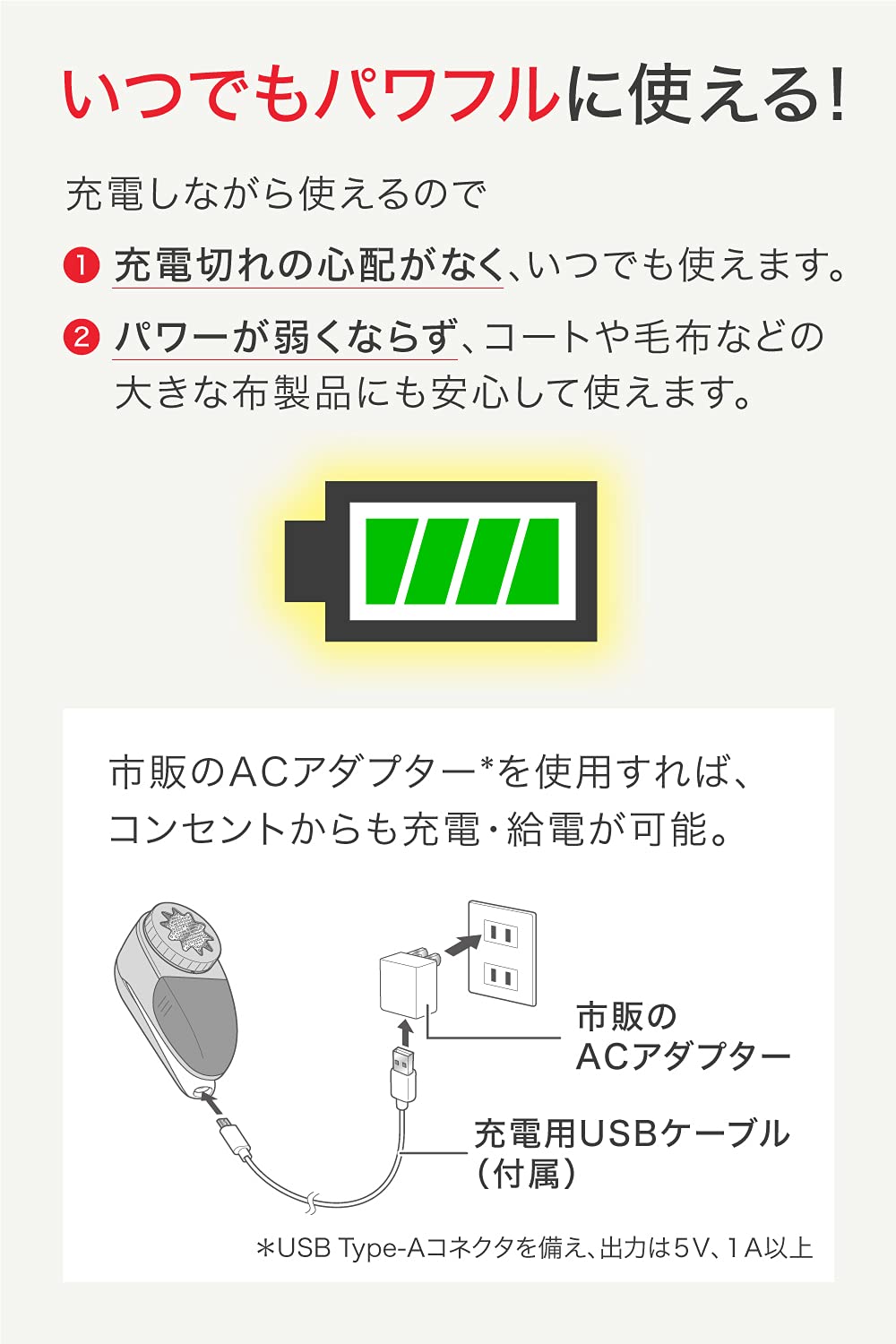 ・使いたいときにいつでも使える「充電式毛玉クリーナー」 ・コードレスでも、充電しながらでも使える。 ・充電池が内蔵されており、付属の充電用USBケーブルを市販のACアダプターに接続して充電できます。