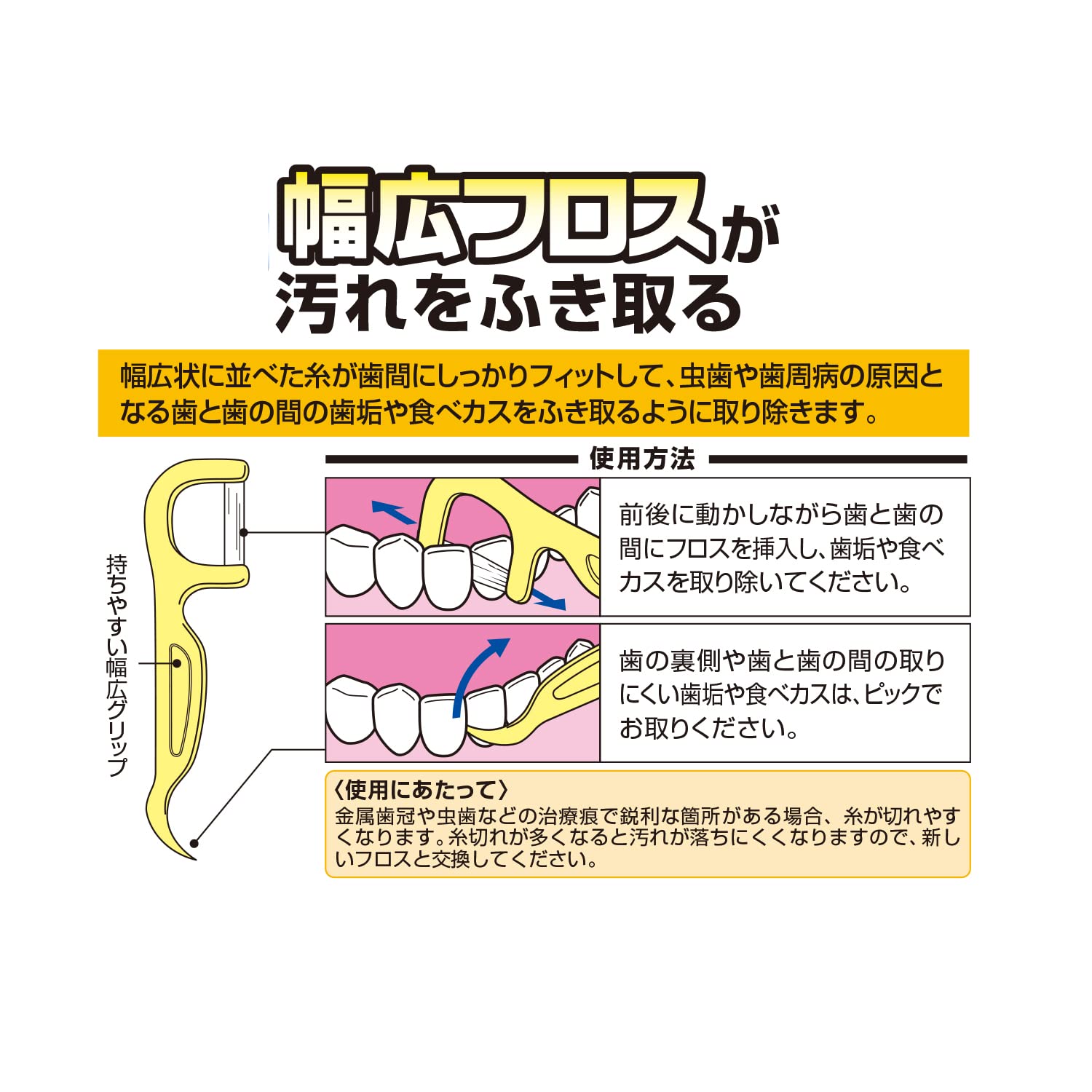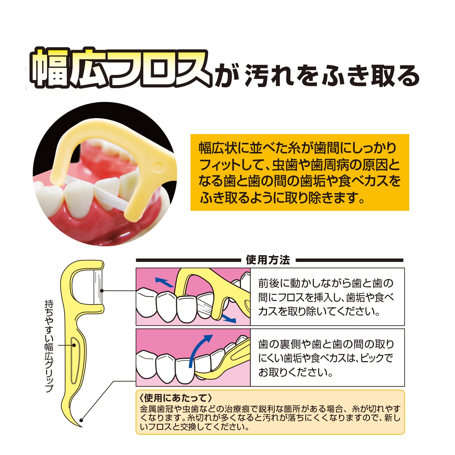 幅広状に並べた糸が歯にしっかりフィットして、虫歯や歯周病の原因となる歯と歯の間の歯垢や食べカスをふき取るように取り除きます。