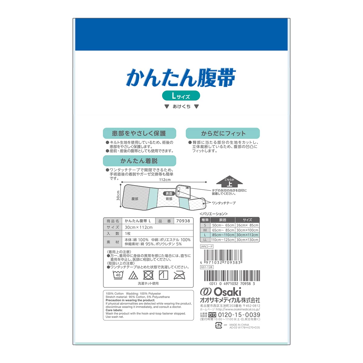 OO Osaki(オオサキ) かんたん腹帯 Lサイズ 1枚入 手術後 ワンタッチ 70938