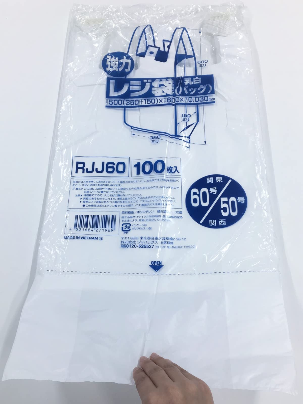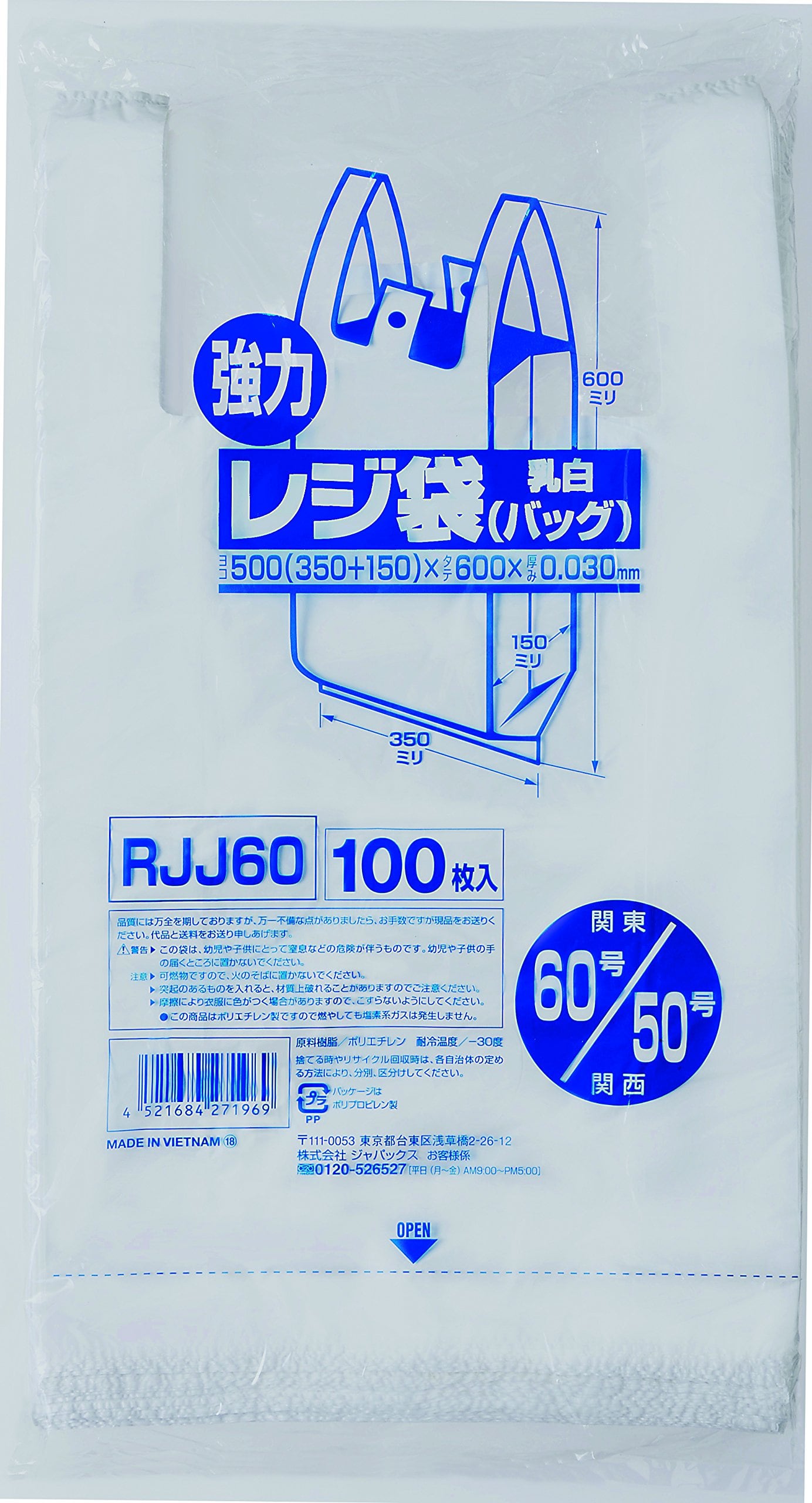 ジャパックス ゴミ袋 乳白 横35cm+マチ15cm×縦60cm 厚み0.03mm 100枚 東日本60号 西日本50号 レジ袋 吊り下げ穴付き 一枚ずつ取り出せる 強力 RJJ60