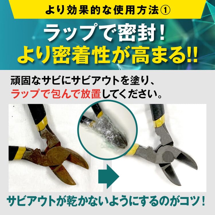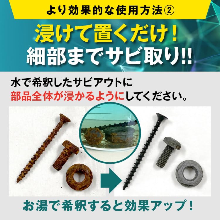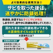 サビと化学的に反応し、金属を傷めず除錆します。金属表面を腐食しないので、小さな部品にも使用可能です。金属表面に油がついていても、サビ取り効果は変わりません。サビが取れたら、水洗いのあと、すぐに塗装ができます。直接塗布したり、水で5から6倍に薄めてお使いいただけます。