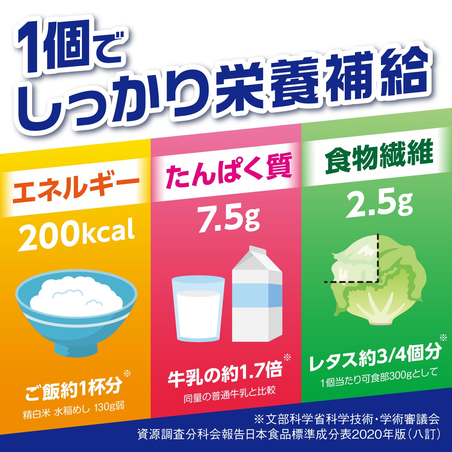 ●たんぱく質7.5g(牛乳の約1.7倍)、食物繊維2.5g(バナナ約2本分)の他、11種類のビタミン、10種類ミネラルなど体に大切な栄養素を1本で効率的に補給できます。
