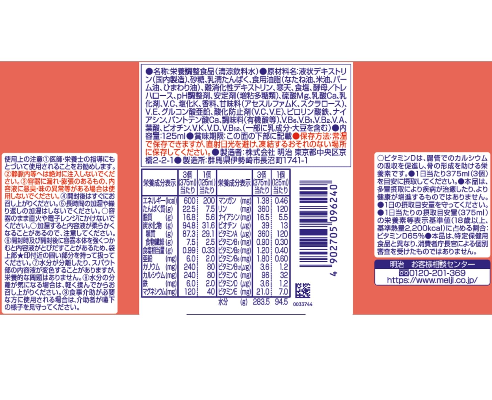 液状デキストリン(国内製造)、砂糖、乳清たんぱく、食用油脂(なたね油、米油、パーム油、ひまわり油)、難消化性デキストリン、寒天、食塩、酵母/トレハロース、pH調整剤、安定剤(増粘多糖類)、硫酸Mg、乳酸Ca、乳化剤、V.C、塩化K、香料、甘味料(アセスルファムK、スクラロース)、V.E、グルコン酸亜鉛、酸化防止剤(V.C、V.E)、ピロリン酸鉄、ナイアシン、パントテン酸Ca、調味料(有機酸等)、V.B6、V.B1、V.B2、V.A、葉酸、ビオチン、V.K、V.D、V.B12、(一部に乳成分・大豆を含む)