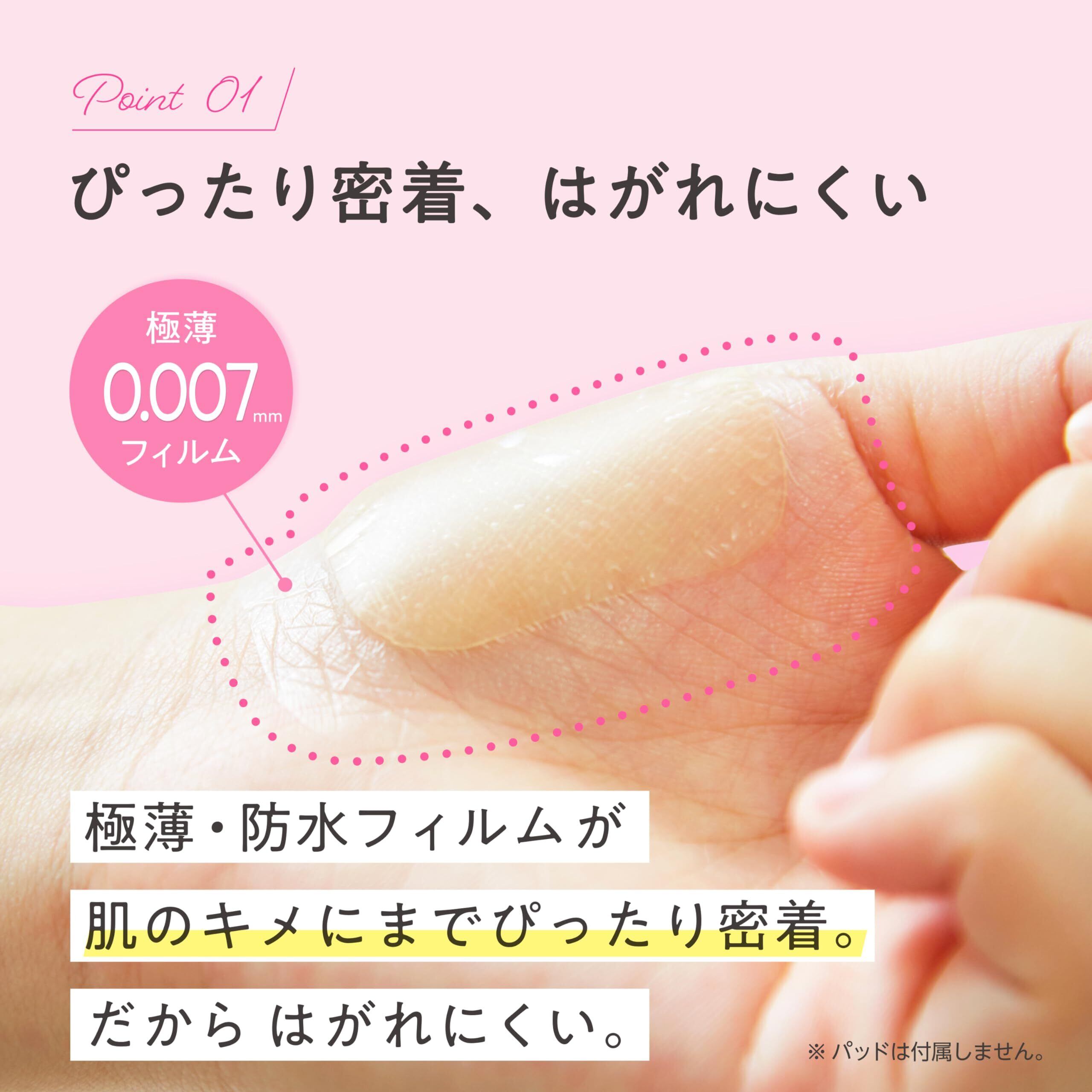 【しっかり防水】 優れた防水力の極薄7ミクロンのウレタンフィルムが肌のキメにまでぴったり密着するので、お風呂やシャワーでもはがれにくいです。