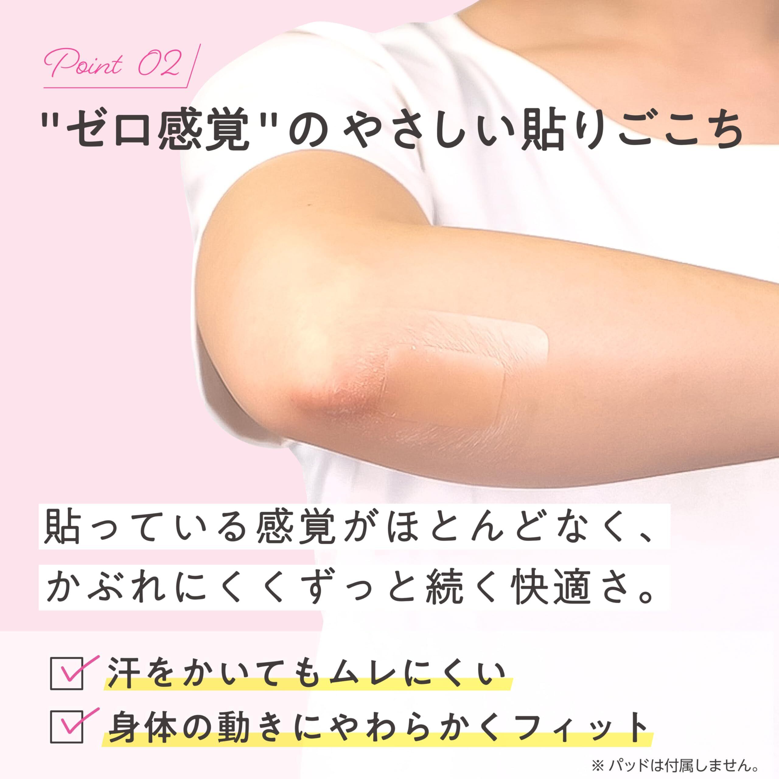 【ゼロ感覚の貼りごこち】 汗をかいても蒸れにくく肌を快適に保ちます。やわらかいフィルムが身体の動きに沿ってしなやかに伸縮するので、貼っている感覚がほとんどありません。