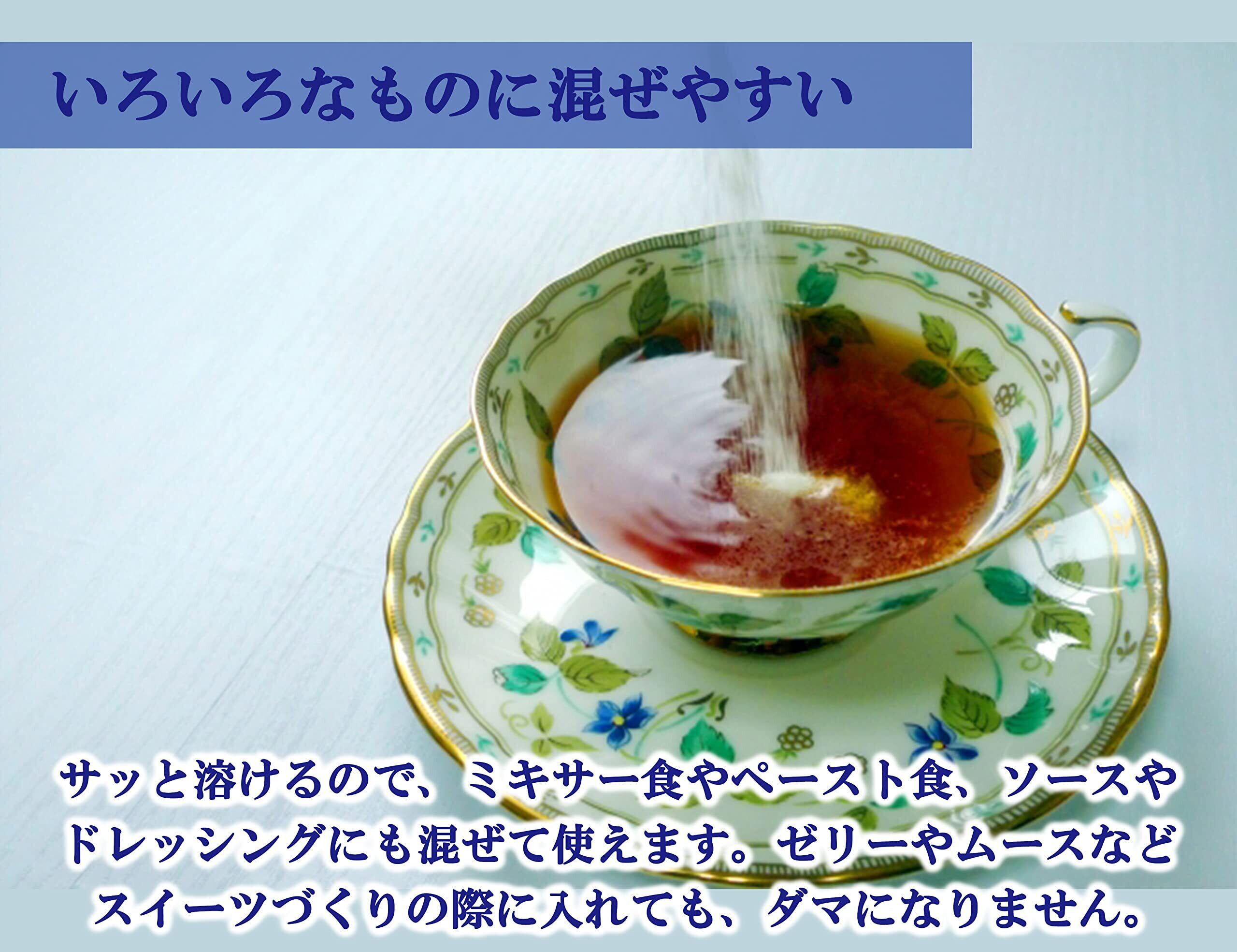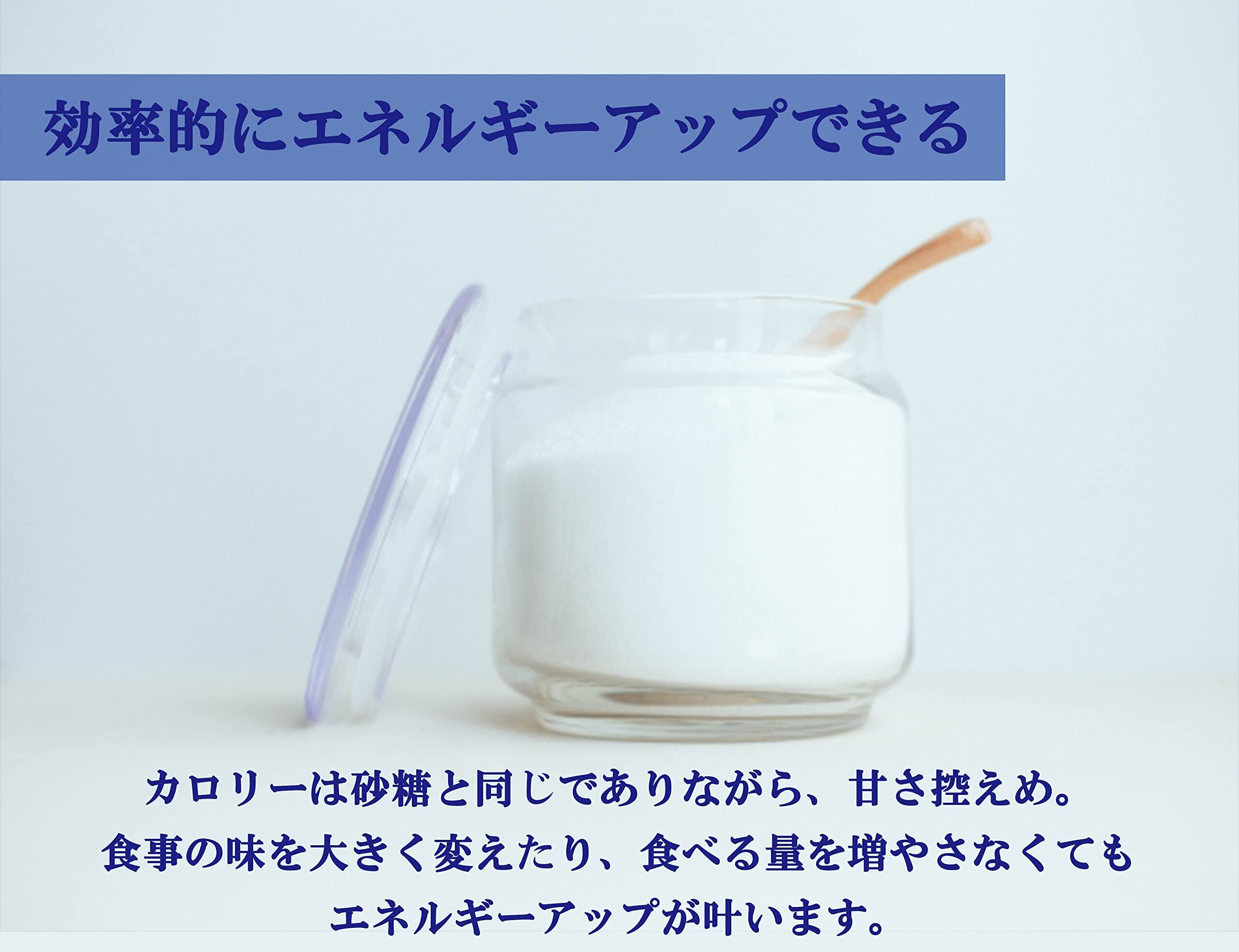 粉飴は、お好きな料理や飲み物に溶かして手軽にエネルギー補給でききる食品です。たんぱく質を含まず、ミネラル(ナトリウム、カリウム、リン)もほとんど含んでいません。甘さ控えめで一度にたくさん摂取できます。スポーツ中のエネルギー補給にも。