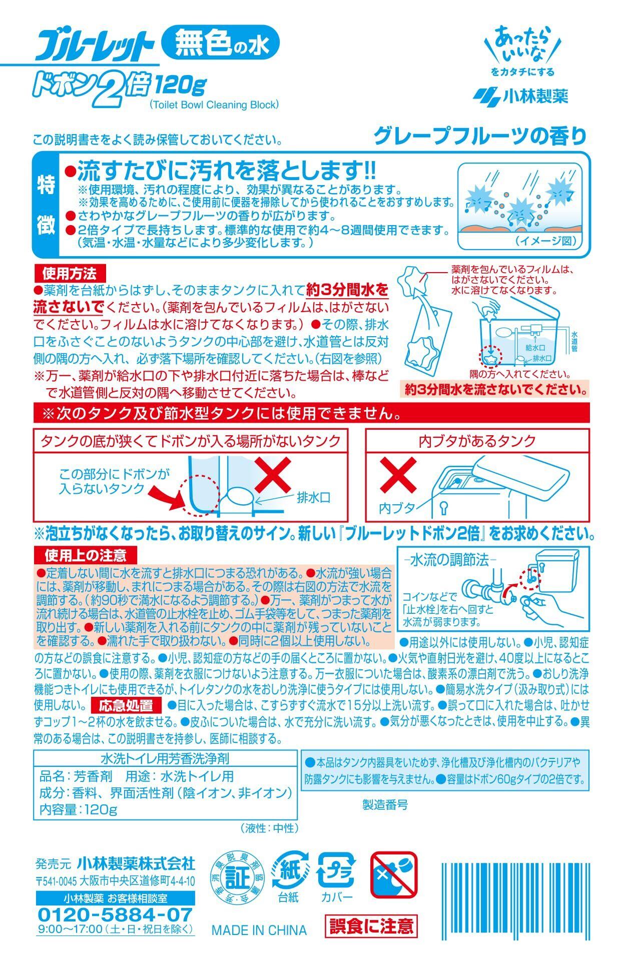 ブルーレットドボン ドボン2倍 トイレタンク洗浄剤 無色 グレープフルーツ 120g