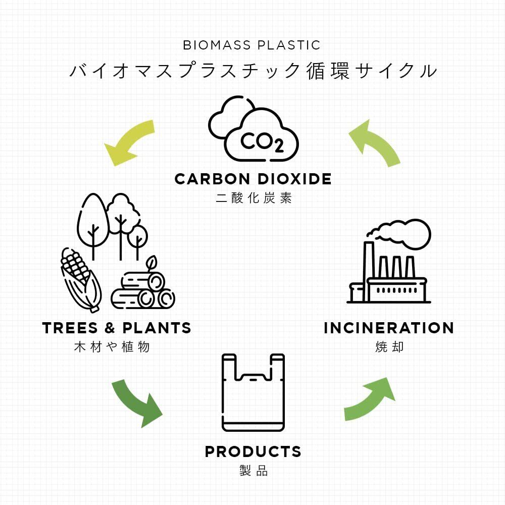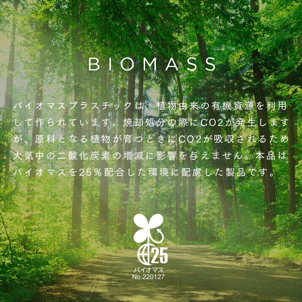 【BIOMASSとは】バイオマスプラスチックは、植物由来の有機資源を利用して作られています。焼却処分の際にCO2が発生しますが、原料となる植物が育つときにCO2が吸収されるため大気中の二酸化炭素の増減に影響を与えません。本品はバイオマスを25%配合した環境に配慮した製品です。