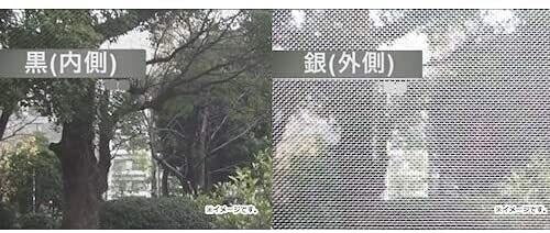 銀が室外になる様に張る事でネットが光線を反射し、室内が見えづらくなる目かくし効果を発揮します。また、室内からはブラックの効果により外の景色がスッキリ見えます。