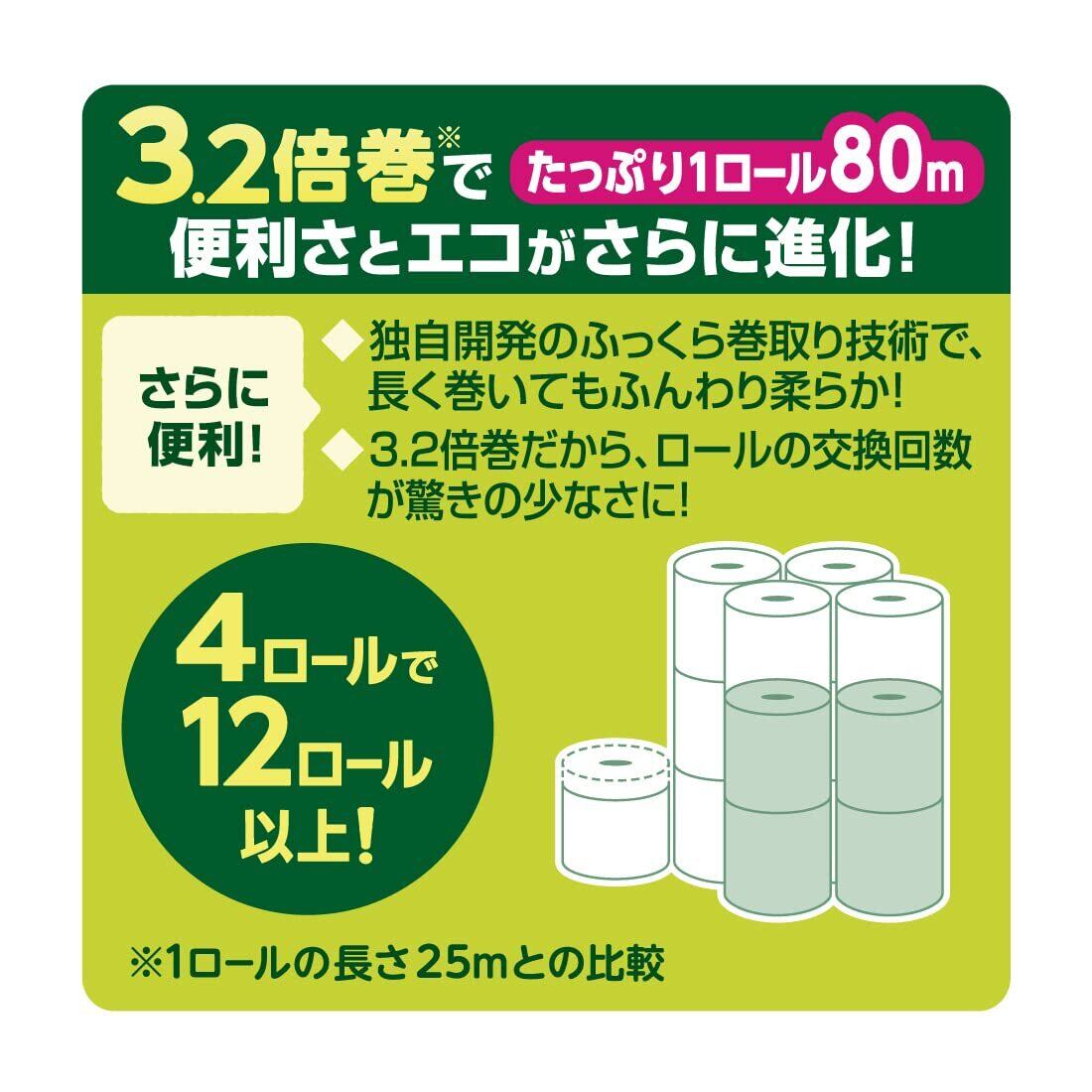 ●1ロール3.2倍巻のたっぷり長持ち。 ※1ロールの長さ25mとの比較。 ●トイレットペーパーの交換や保管スペー スを減らせます。 ●握りやすく、開けやすい取っ手形状。 ●ふっくら巻き取り技術で、長く巻いても柔 らかな肌触りを実現。 ●華やかなフローラルの香り。 ●通常巻24ロール分以上※の大容量。 ●パルプ100%。
