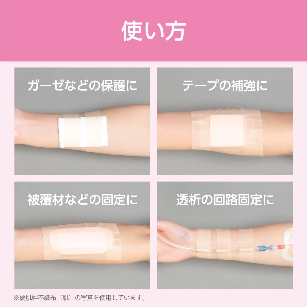 優肌絆(R)の粘着剤は柔らかいゲルタイプで、従来のテープにはなかったものです。皮膚の凸凹にぴったりとなじんで皮膚によく密着するため、粘着力は従来のままに、しかも剥がす時に角質層を剥離・損傷しません。何度も同じ場所に使用する方、人工透析を受けている方、従来のテープでお困りの方にぜひお試しください。