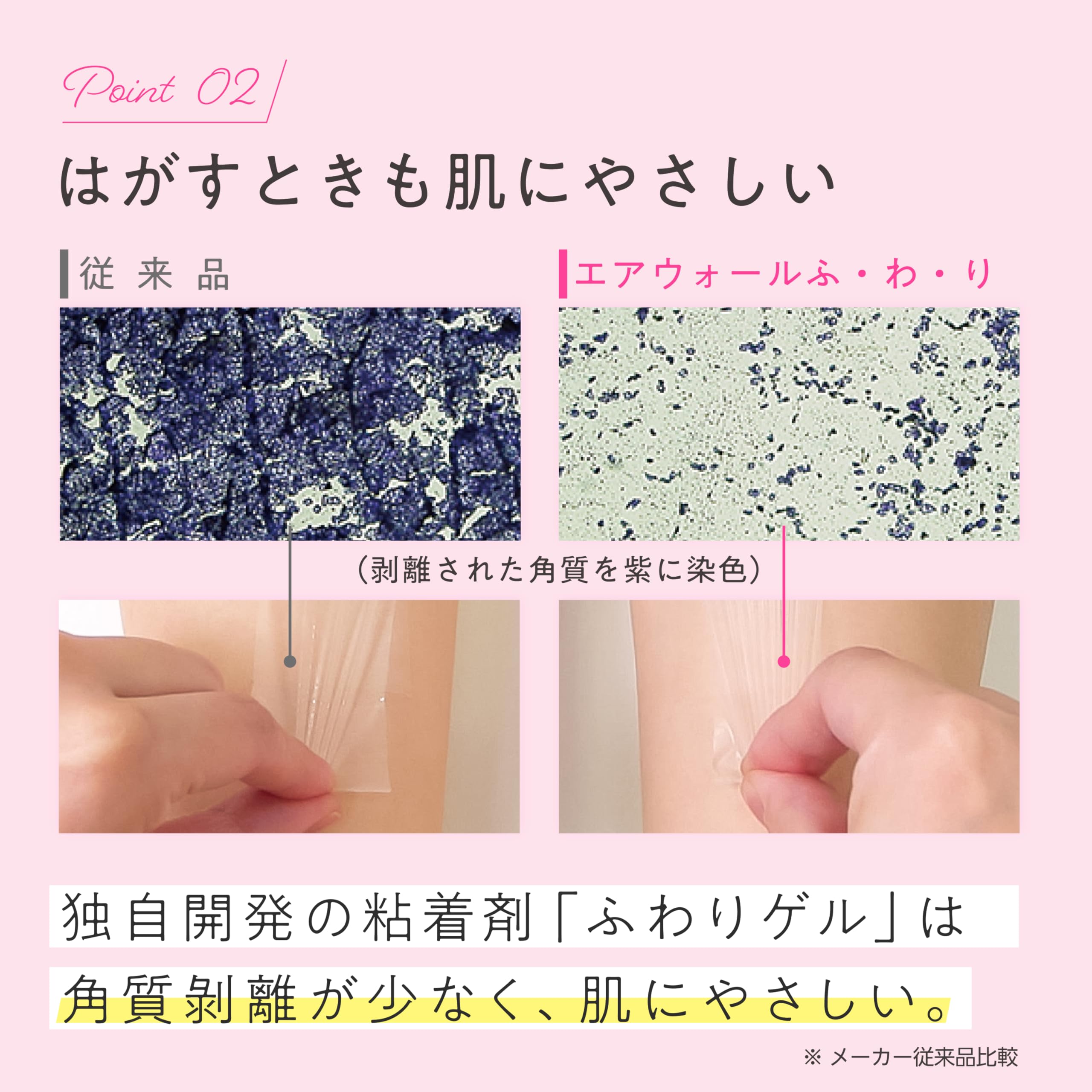 【はがす時も快適】 独自開発の低刺激粘着剤「ふわりゲル」は、はがす時の角質剥離が少なくお肌に優しいです。こどもからご高齢者まで安心して使えます。