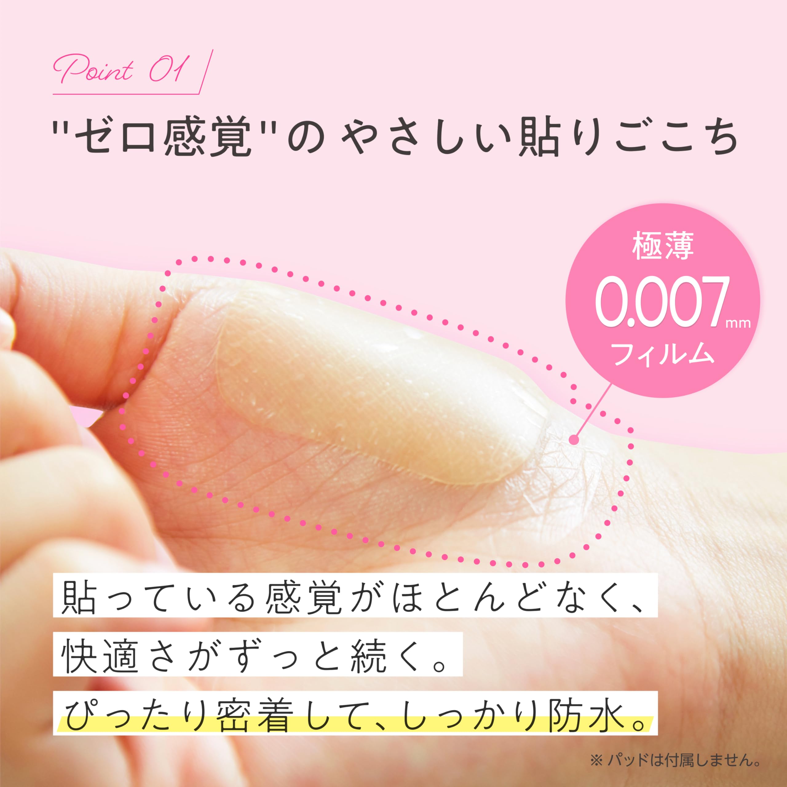 【しっかり防水】 優れた防水力の極薄7ミクロンのウレタンフィルムが肌のキメにまでぴったり密着するので、はがれにくくしっかり防水できます。