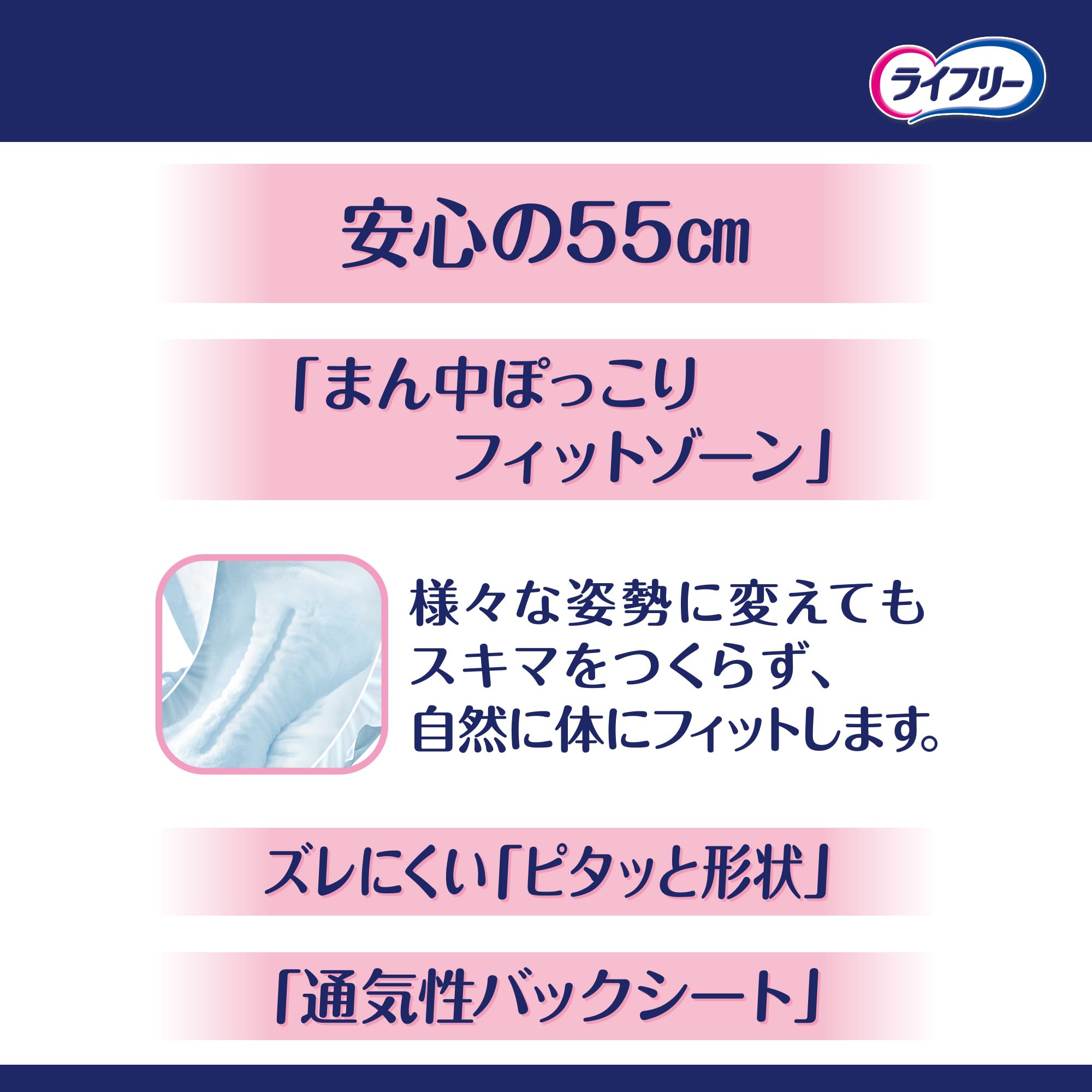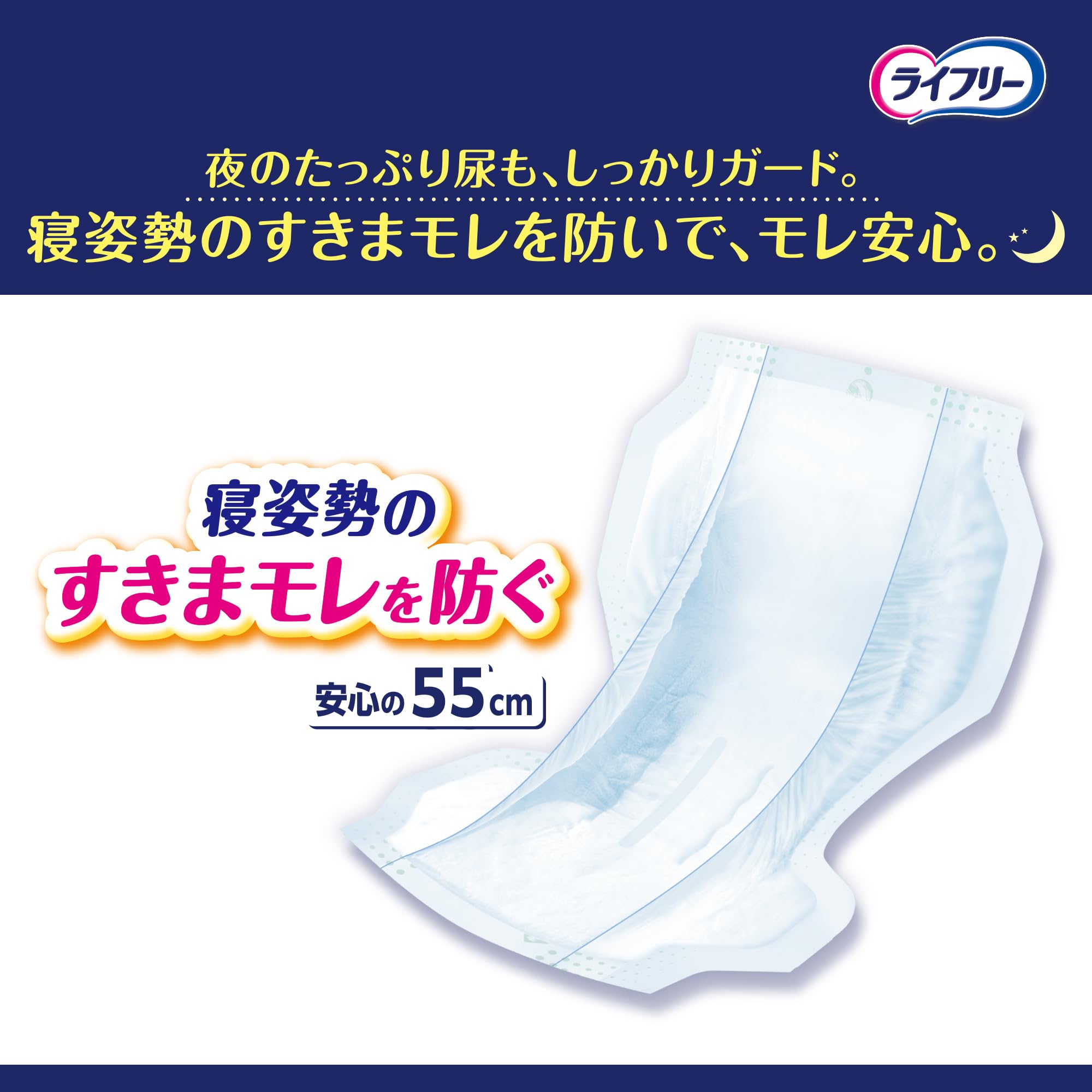 たっぷり4回分をぐんぐん吸収するので、尿量の多い方でも一晩中安心な尿とりパッドです。1ロング55㎝がおしりまですっぽり包み込み寝姿勢でもモレずに安心。2吸引スポットが尿を素早く下層に引き込みスピード吸収。3山折フィットゾーンがどんな姿勢でもスキマをつくらずフィット。4横モレあんしん立体ギャザーが体にフィットして横モレを防ぐ。5通気性バックシート採用で、おむつ内部の湿気を外に逃がすのでムレにくい