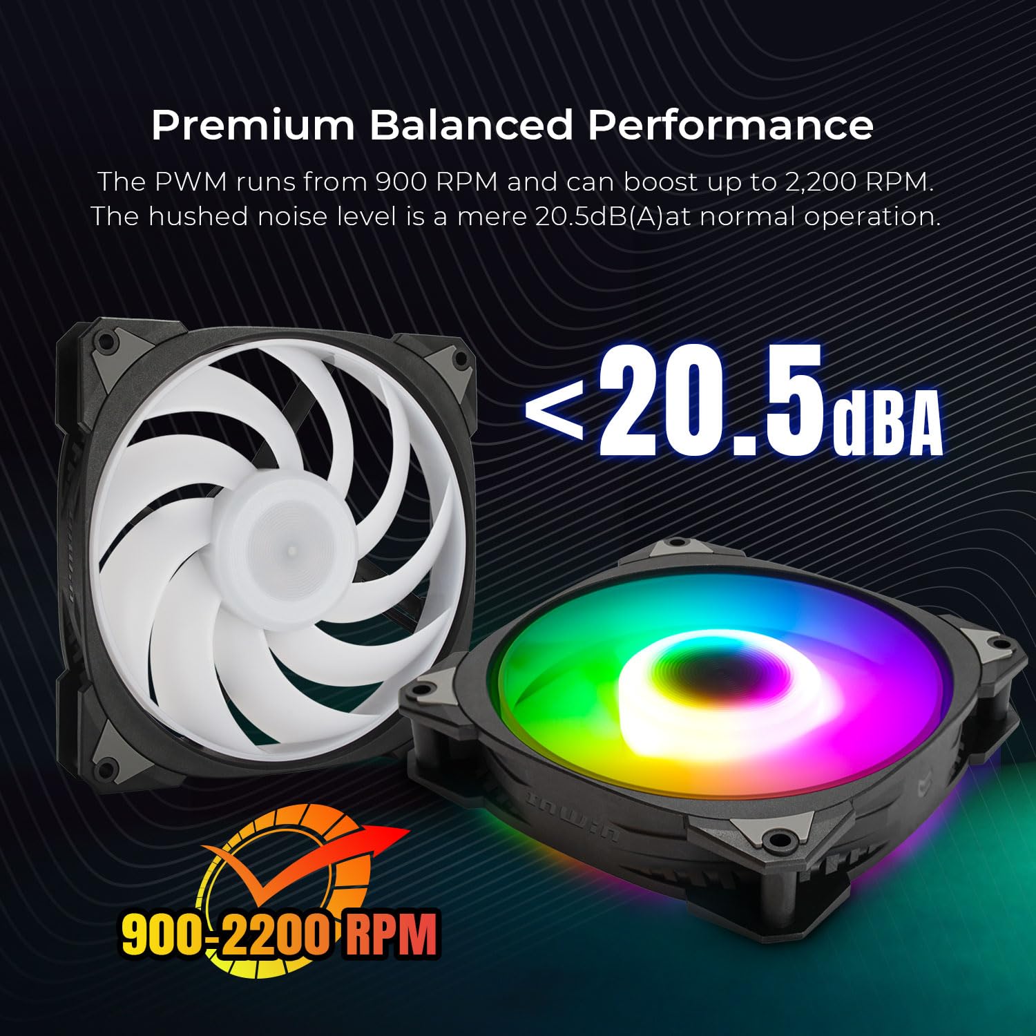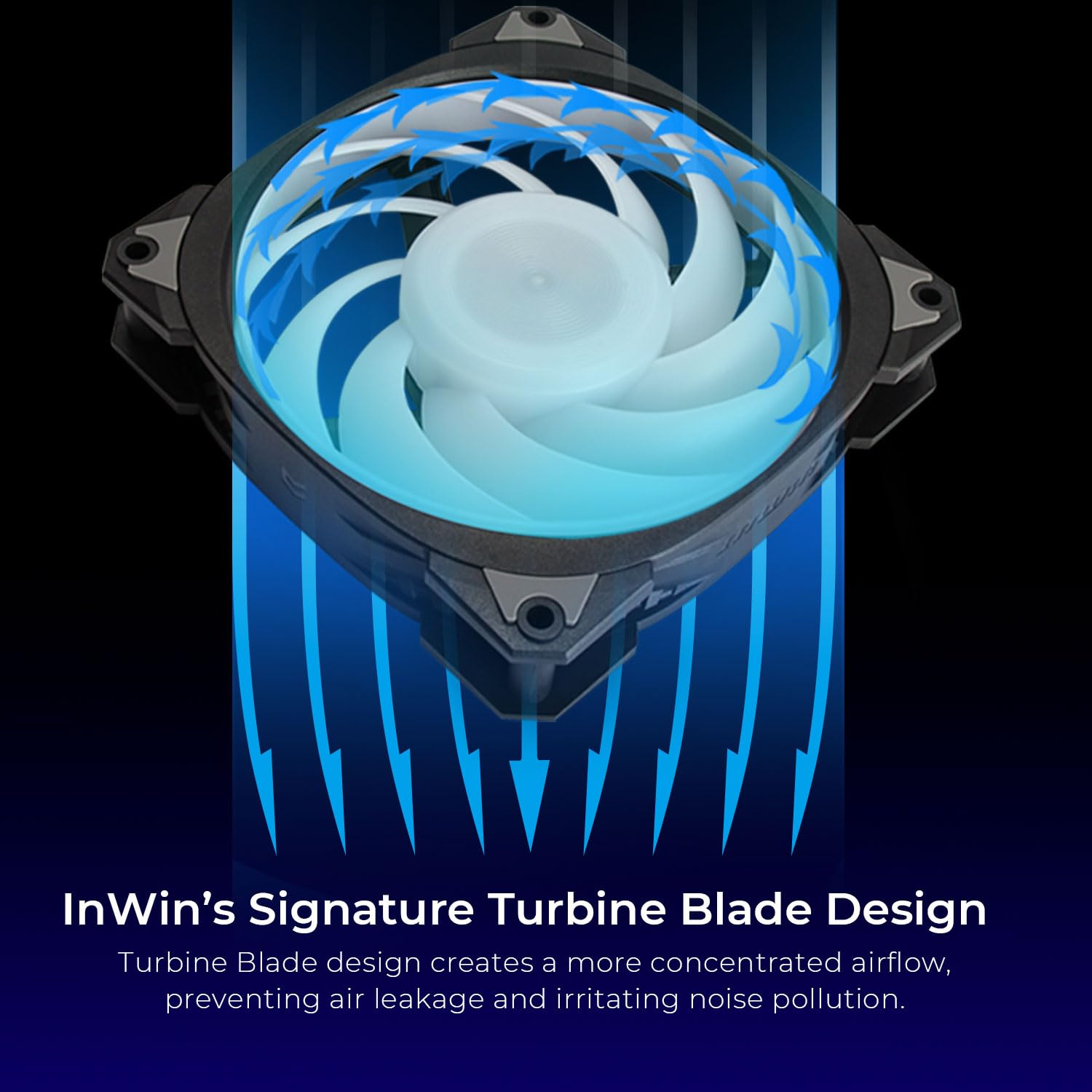 InWin独自のタービンブレードデザインで、静かな冷却と効率的な空気の流れを体験してください。 ファンブレードをフレームに成形することで、より集中した空気の流れを作り出し、空気の導入と刺激的な騒音公害を防ぎます。