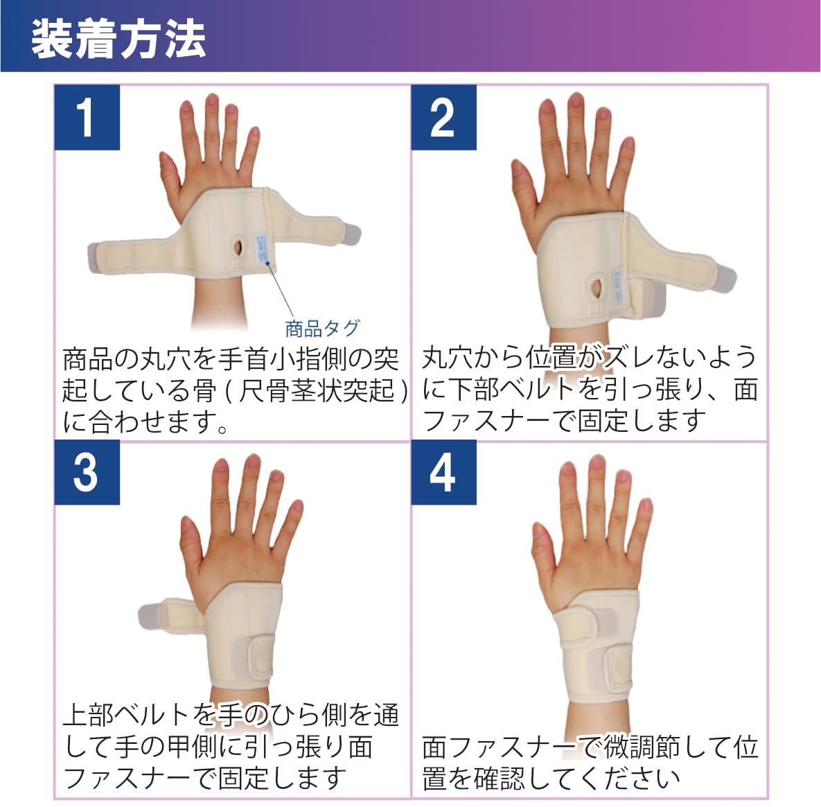 ●使用方法:※この商品は左右兼用です。 (1)肌側、上下をお確かめください。 ・商品タグの付いている方が外側です。 商品の丸穴を尺骨茎状突起(手首小指側の突起している部分)に合わせます。 (2)下部ベルトを接着します。 丸穴の位置がズレないように押さえながら、下部ベルトを手のひら側を通して適度な力で手の甲側に引っぱり、面ファスナーで固定します。(商品タグと丸穴を覆うように接着します。) (3)上部ベルトを接着します。 丸穴の位置がずれないように押さえながら、上部ベルトを手のひら側を通して適度な力で手の甲側に引っぱり、面ファスナーで固定します。 (4)装着状態を確認してください。 丸穴がしっかり突起部分に位置するように、調整してください。