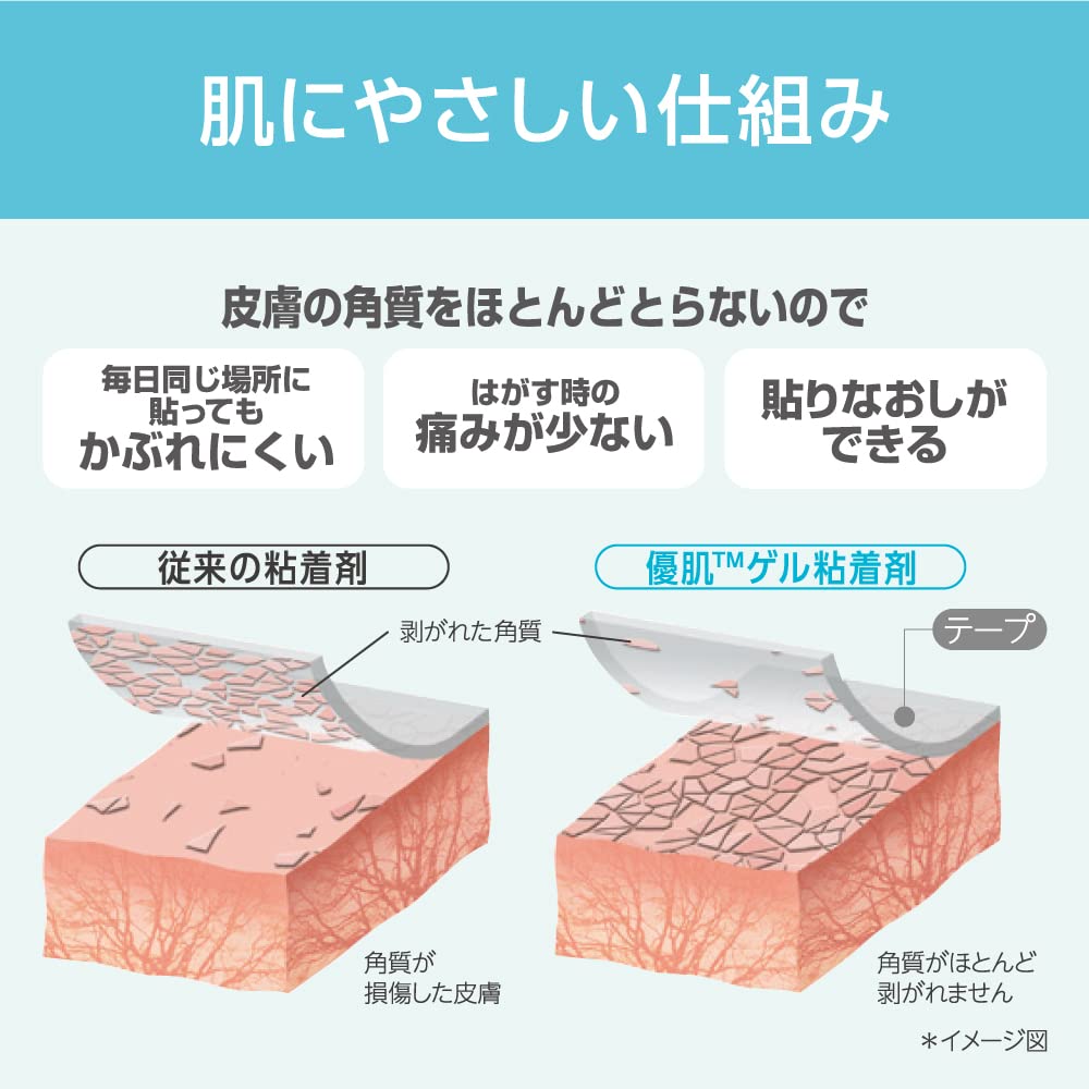 かぶれの少ないゲル粘着剤を使用し、テープを剥離する際の角質剥離を軽減します。
