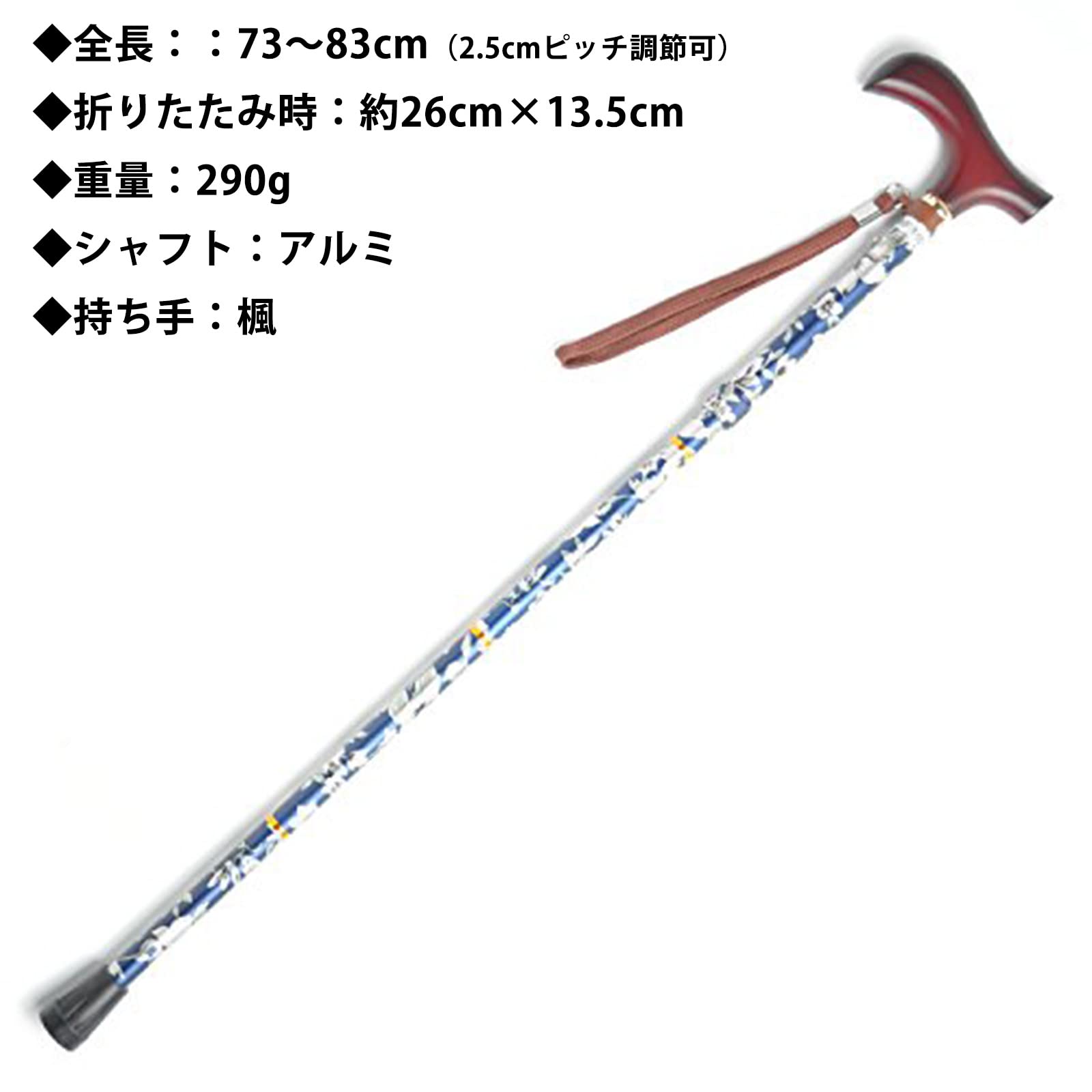 【長さ調節可能】グリップ高さ:73~83cm(2.5cmピッチで調整可)5段階に長さ調節できるのであらゆる身長の方に。 長さ調節も簡単です。パイプ径:手元19mm、杖先16mm