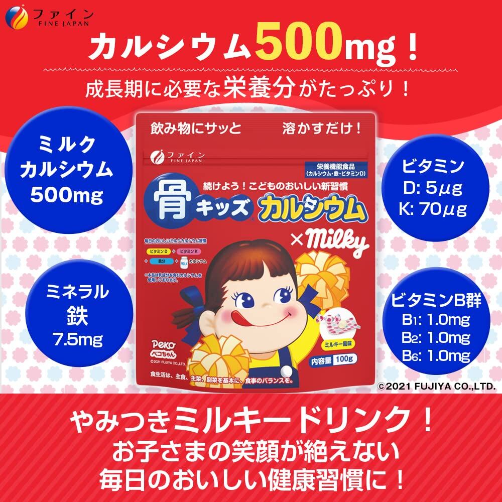 カルシウム500mgがきっちり摂れるよう設計されています。お子さまの成長を願い作られた商品です。子育てでは、食が細い、好き嫌いがある、牛乳嫌いなど気になることがたくさん。一日500mgのカルシウムがおいしくきっちり摂れて経済負担も少なく続けられます。ペコちゃんをキャラクターに、ミルキー風味でおいしく仕上げました。ホットでもおいしいよ。
