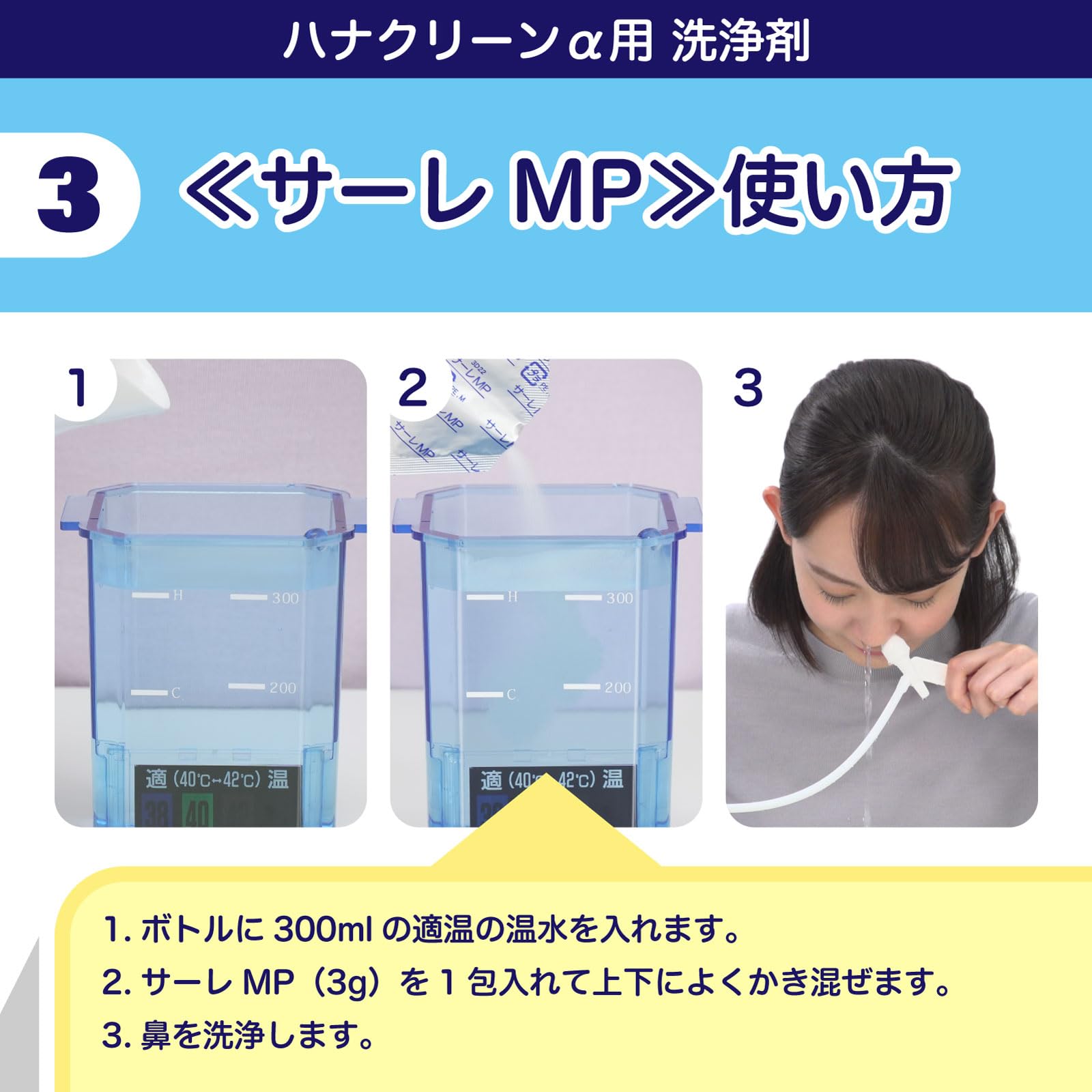 ●ハナクリーンのボトルに入れた300mlの温水にサーレMPを1包(3g)入れ、よく溶かして使用してください。