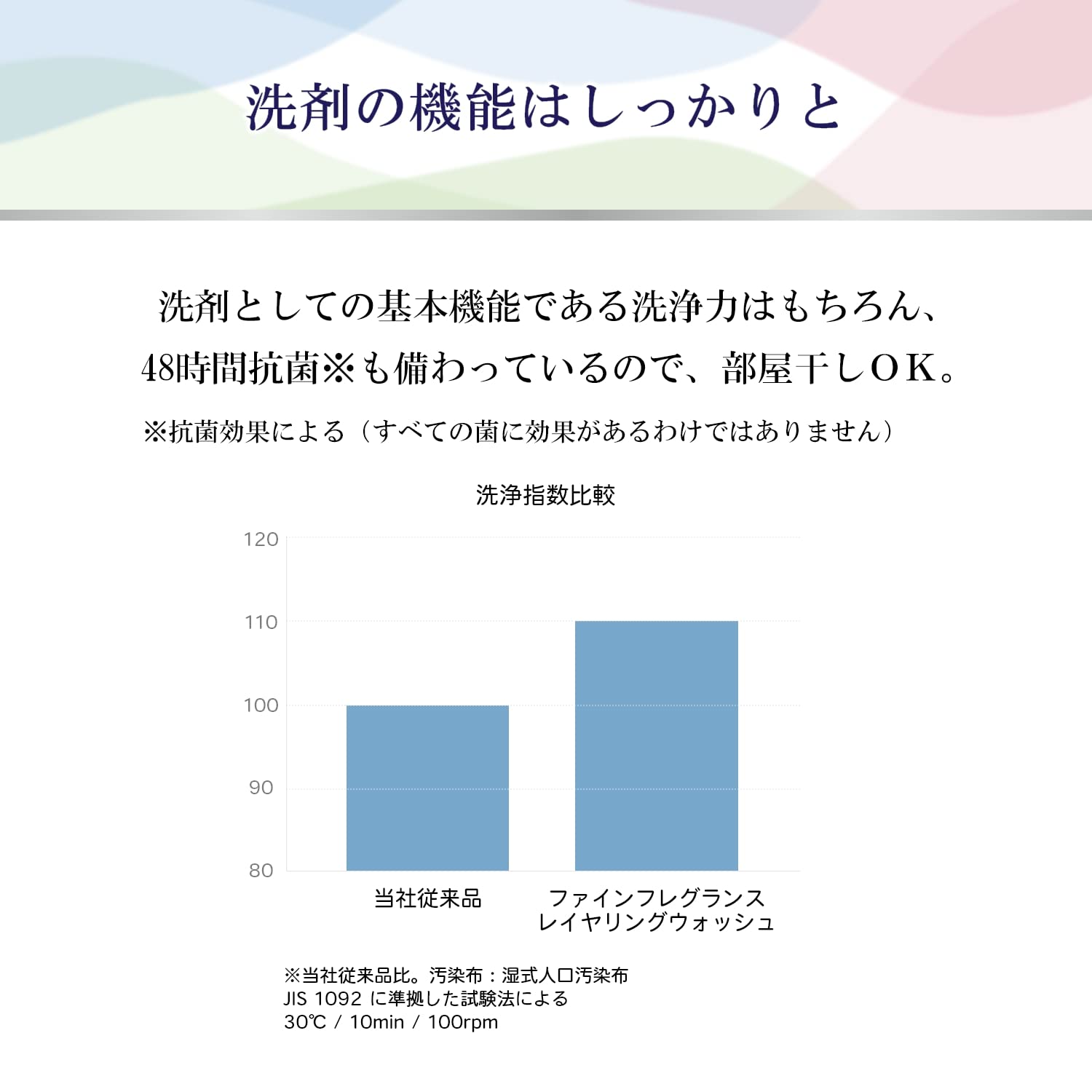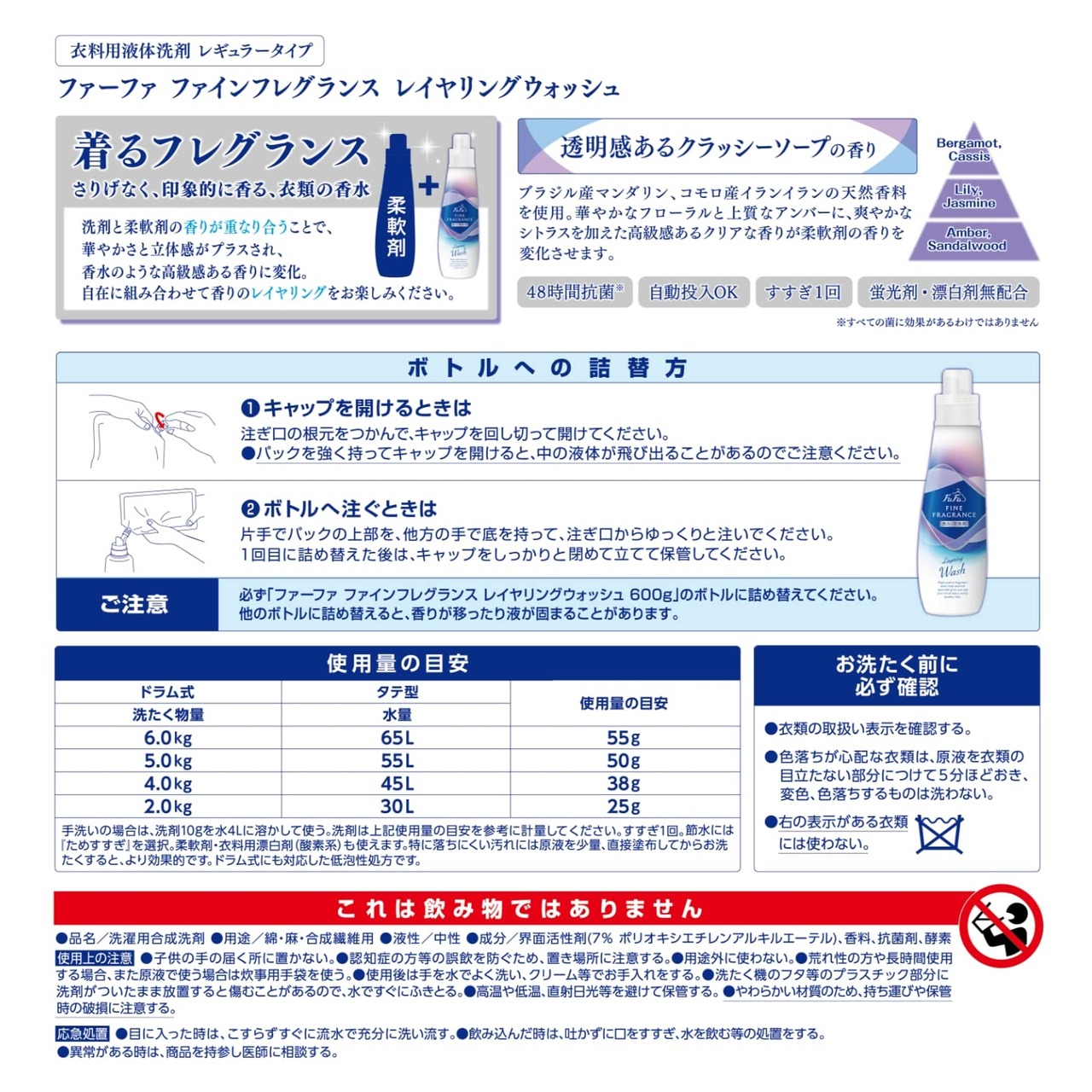 ●素材選定・製造方法からこだわった飽きのこない深みある香り。●新発売の洗剤は、洗剤と柔軟剤の香りをレイヤリング(重ねる)ことで、衣類の香りをより香水のような華やかで立体感ある香りへ変化させます。●世界中の高品質素材を厳選。●洗剤としての基本機能である洗浄力はもちろんの事、48時間抗菌と防臭成分配合で、部屋干しOK。すすぎ1回。※すべての菌に効果があるわけではありません。●蛍光剤無配合。●レギュラータイプ。●透明感あるクラッシーソープの香り。