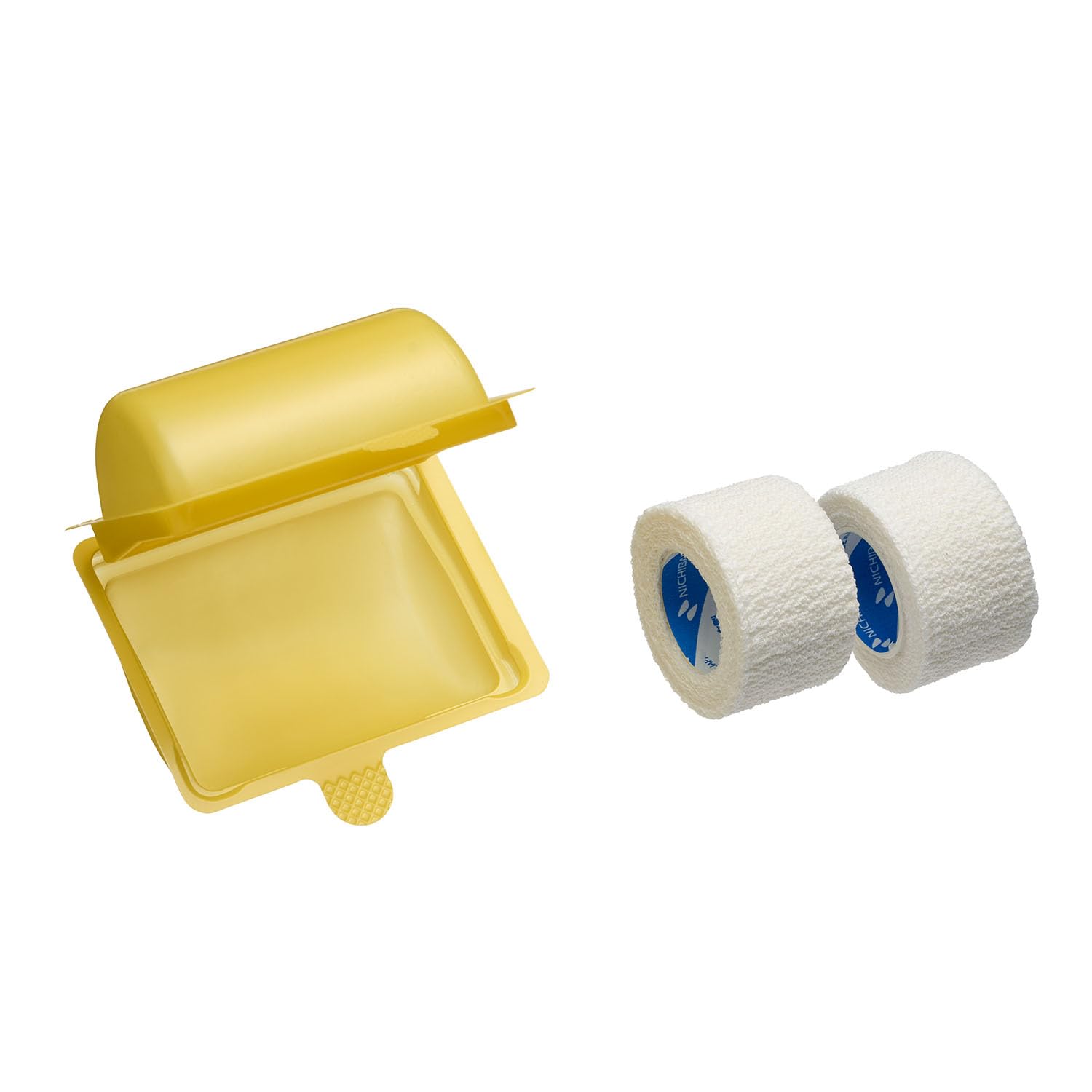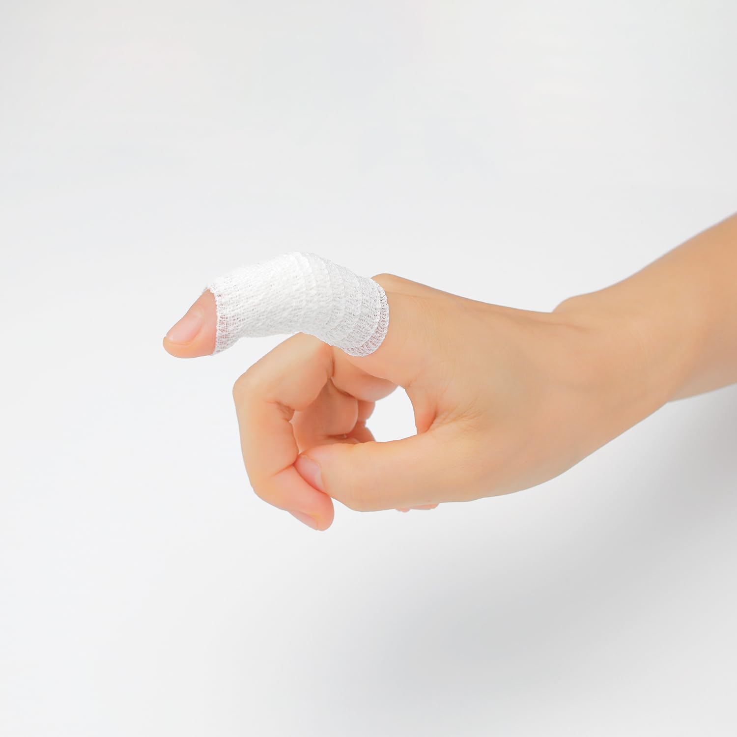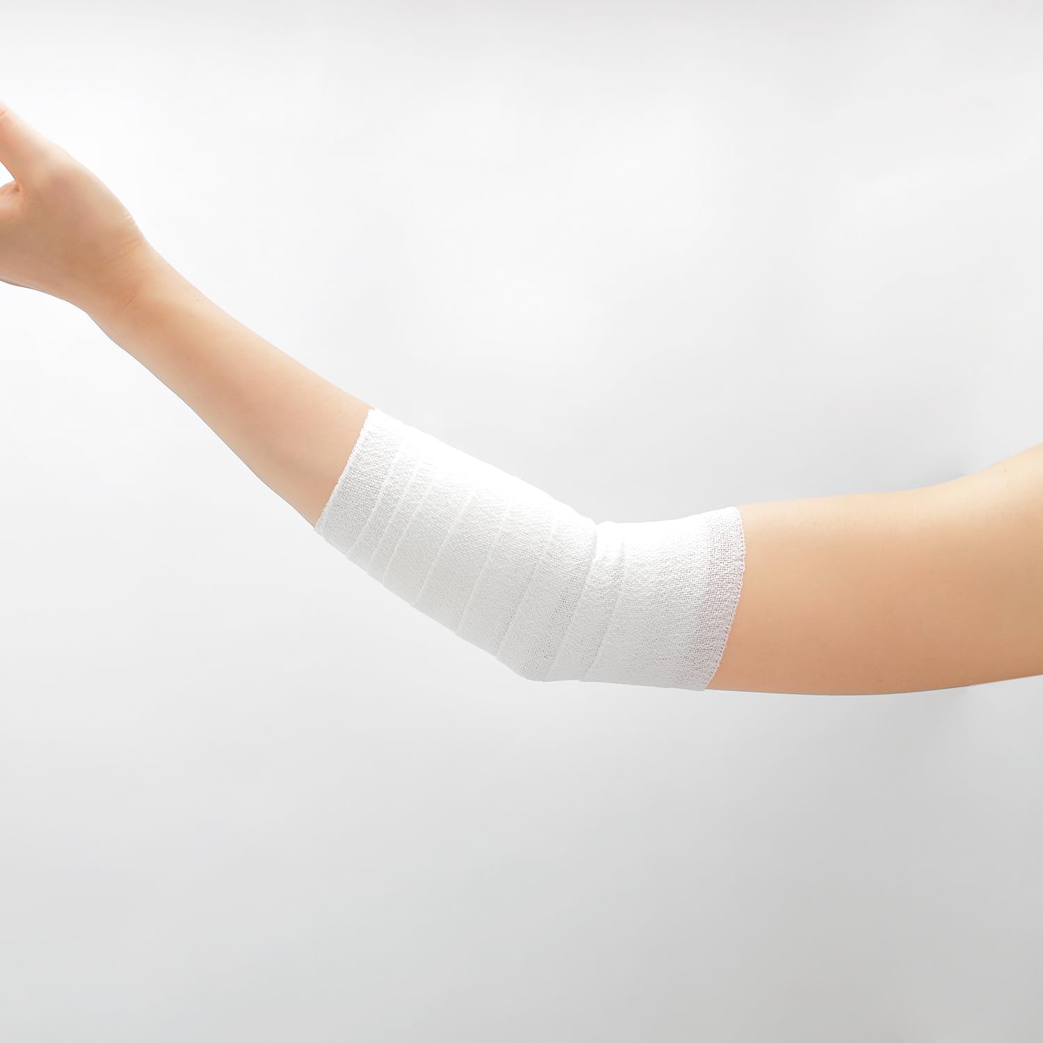 ●重ねて巻いて押さえるだけでくっつく便利な自着性伸縮包帯。