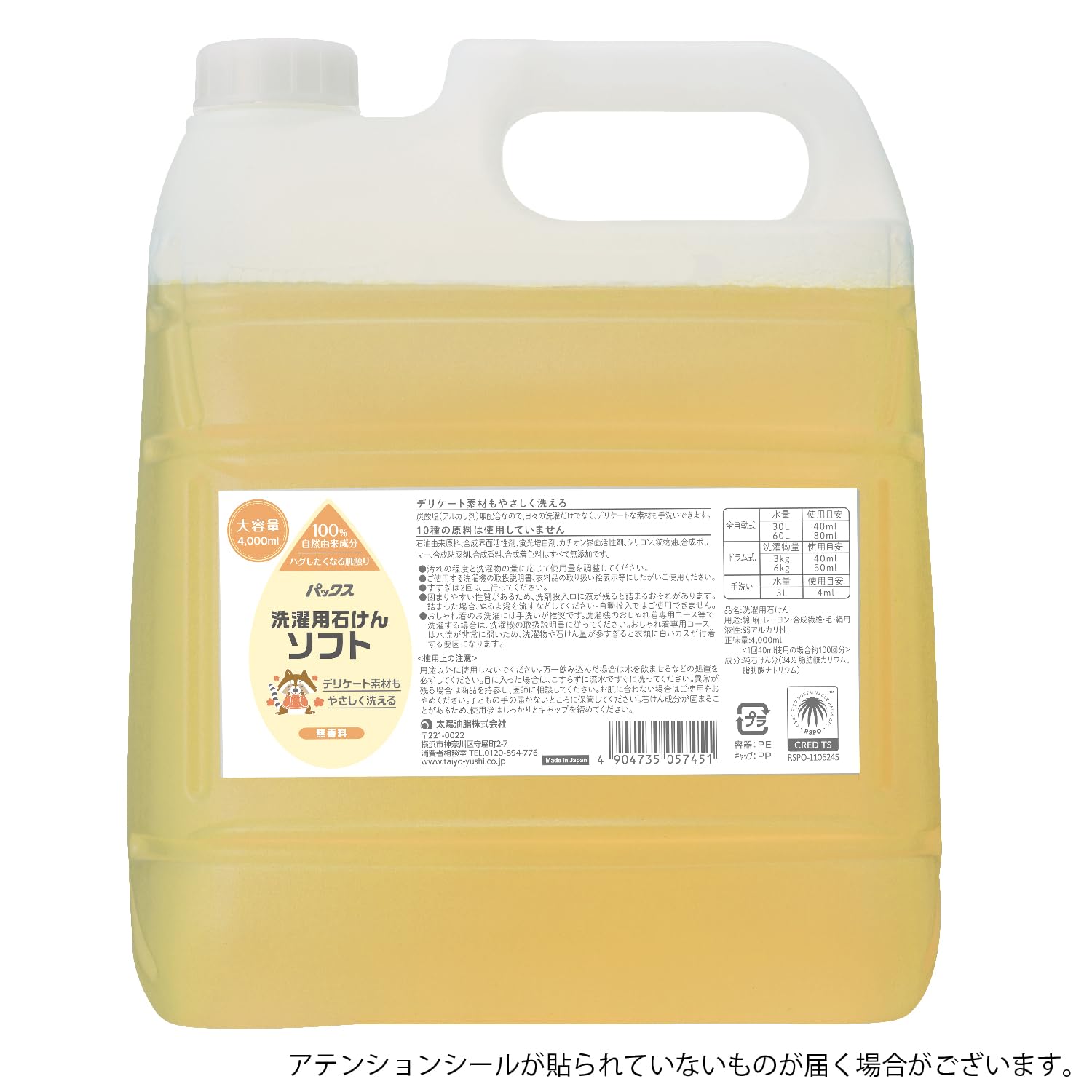 パックス 洗濯用石けんソフト 詰替用 大容量 4000ml 敏感肌 無添加 無香料 おしゃれ着 天然由来100% 洗濯洗剤 太陽油脂