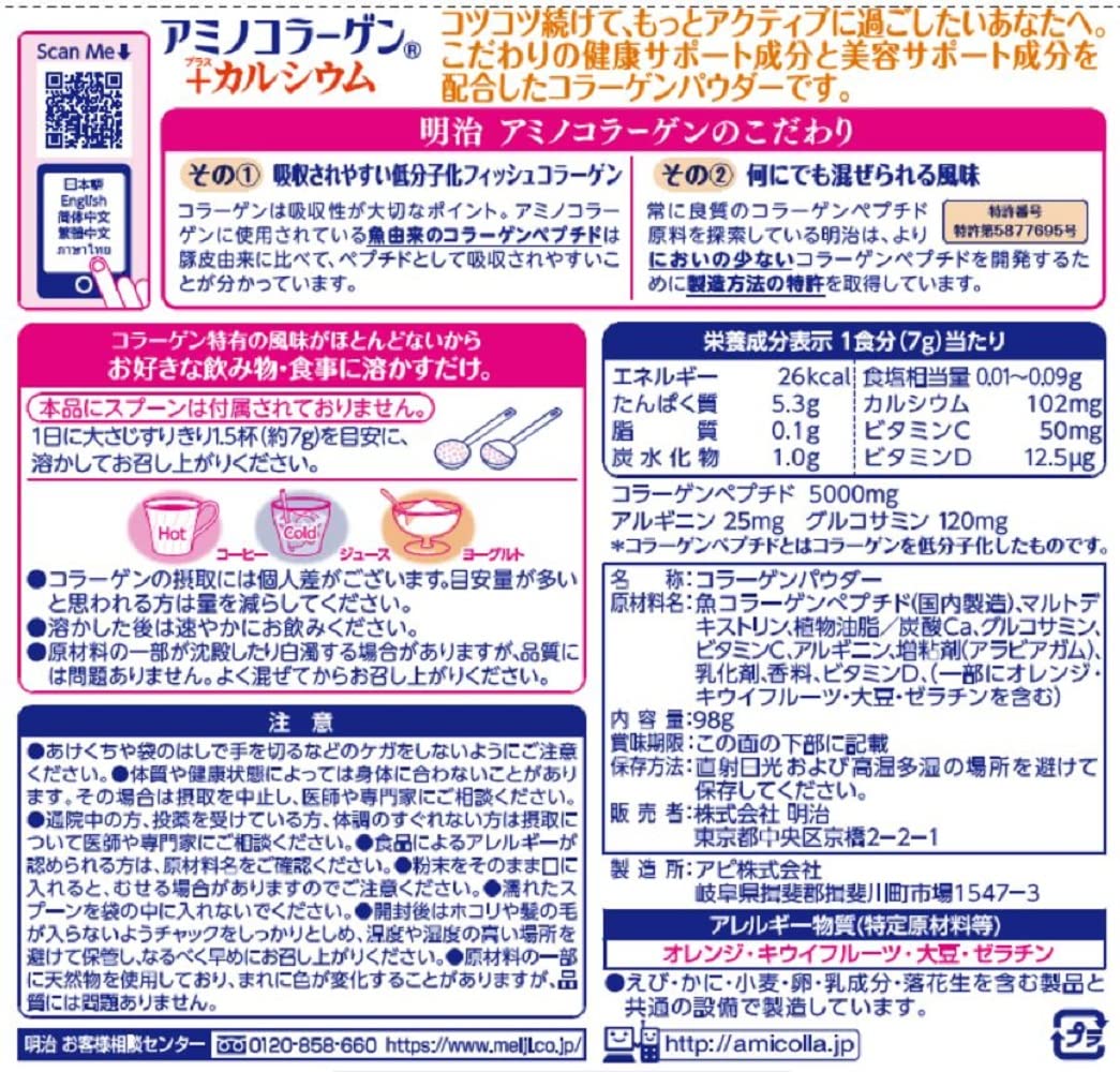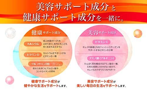 魚コラーゲンペプチド、マルトデキストリン、植物油脂/炭酸Ca、グルコサミン、ビタミンC、アルギニン、増粘剤(アルビアガム)、乳化剤、香料、ビタミンD、(一部にオレンジ、大豆、ゼラチン、キウイフルーツを含む)