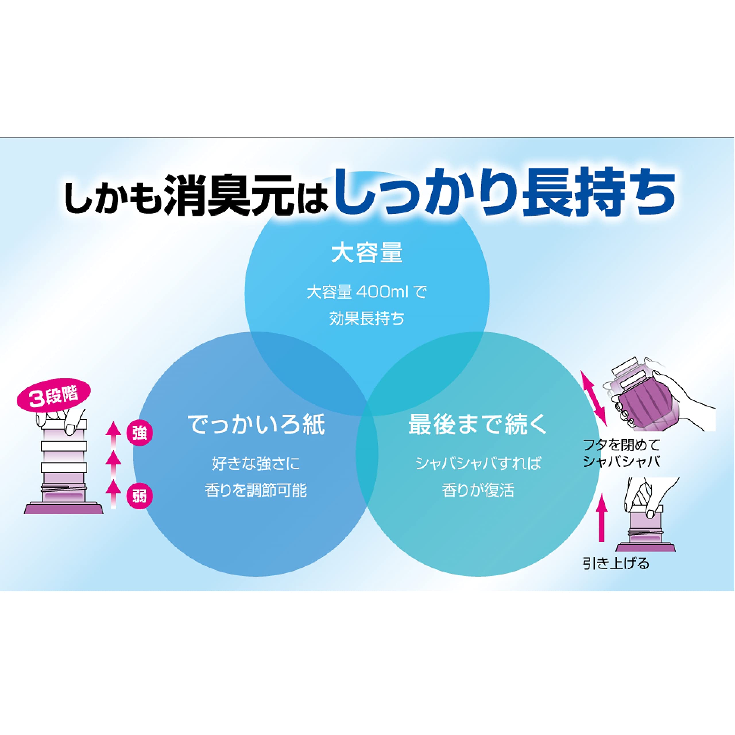 ●ぶっといろ紙が強力に消臭し、いい香りが続く。●大容量400mLで効果長持ち。●ろ紙の引き上げで効果が調節できる。●ろ紙が隠れるキャップ付き。●倒れにくいボトル形状。