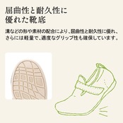 つま先はゆるやかな反り返りカーブでつまずきにくく、軽量設計で歩きやすい