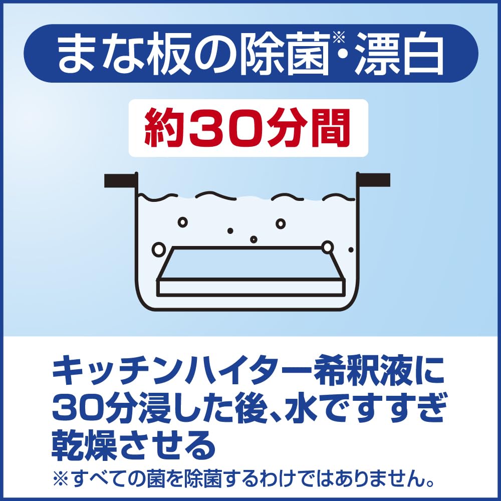 台所用洗剤では落ちない、ふきん・まな板などのシミ汚れ・黄ばみ汚れをきれいに落とします。ふきん・まな板などの除菌・消臭にもすぐれた効果を発揮。