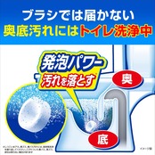 ●洗浄つぶ入り発泡錠が、トイレブラシでは届かない水洗トイレの便器の底(水たまり部分)・奥の黒ズミ・黄バミ・水アカを落とします。