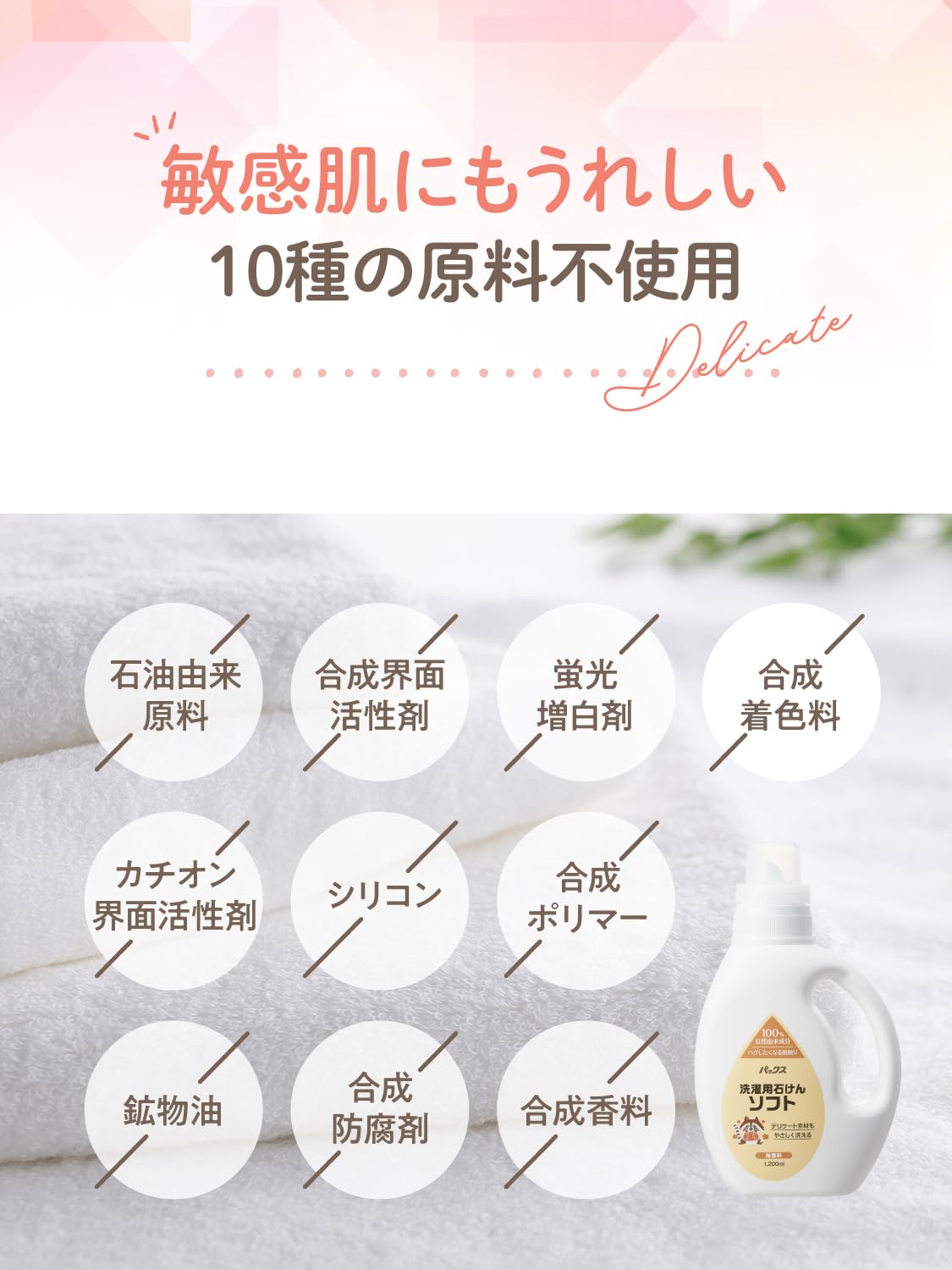 ●10種の原料は使用していません●石油由来原料、合成界面活性剤、蛍光増白剤、カチオン界面活性剤、シリコン、鉱物油、合成ポリマー、合成防腐剤、合成香料、合成着色料はすべて無添加です