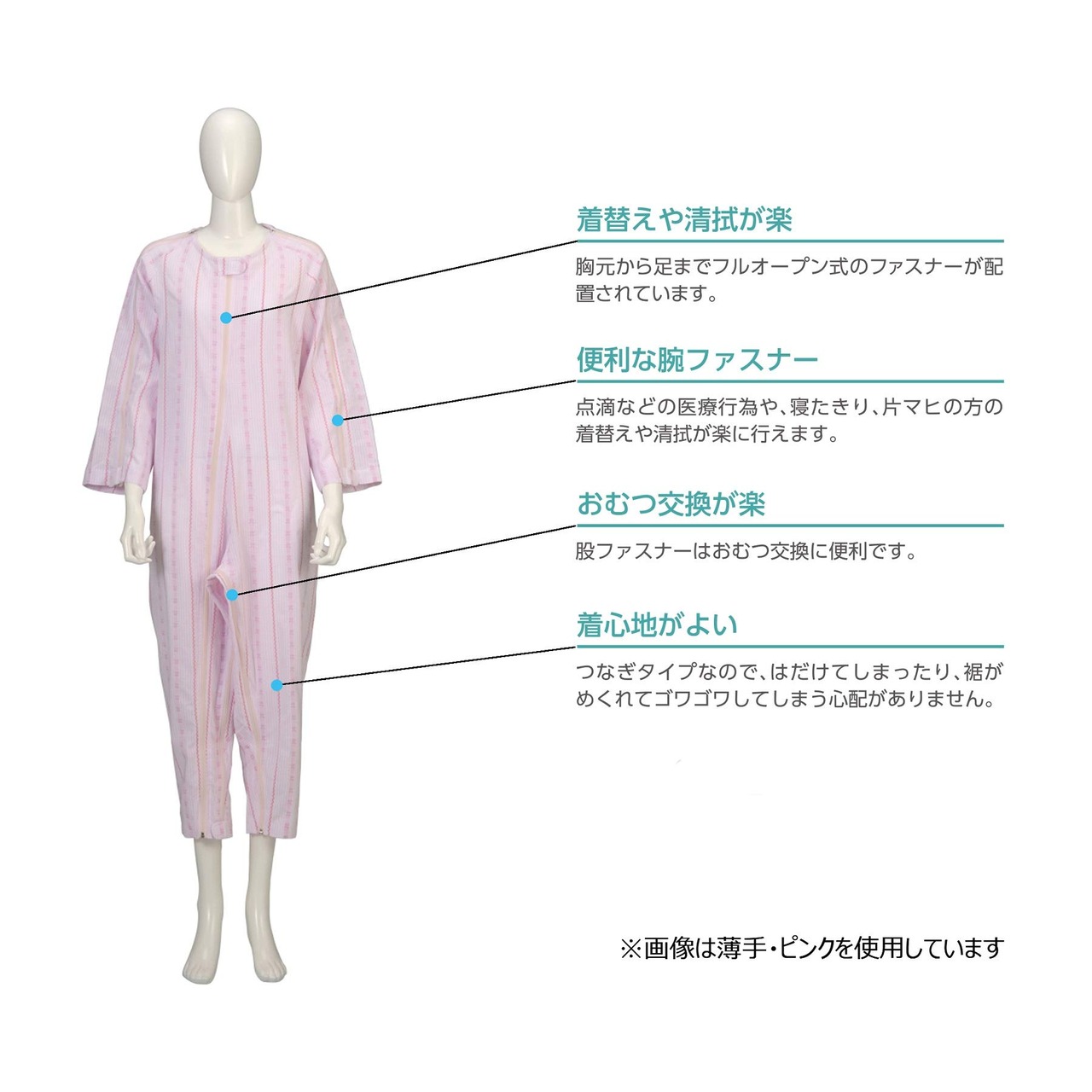・フルオープン式のファスナーや股ファスナーを前面に配置することにより、着替えや清拭・おむつ交換がしやすくなります。