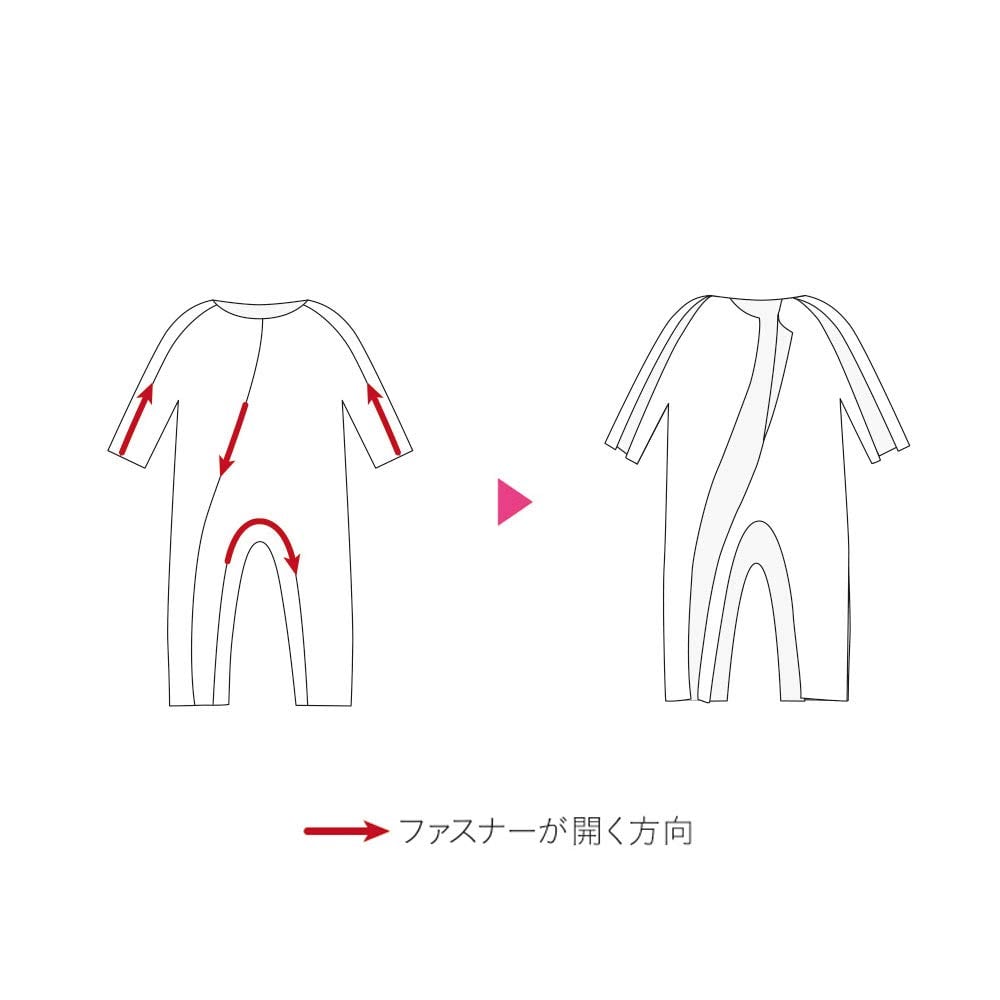 ・フルオープン式のファスナーや股ファスナーを前面に配置することにより、着替えや清拭・おむつ交換がしやすくなります。