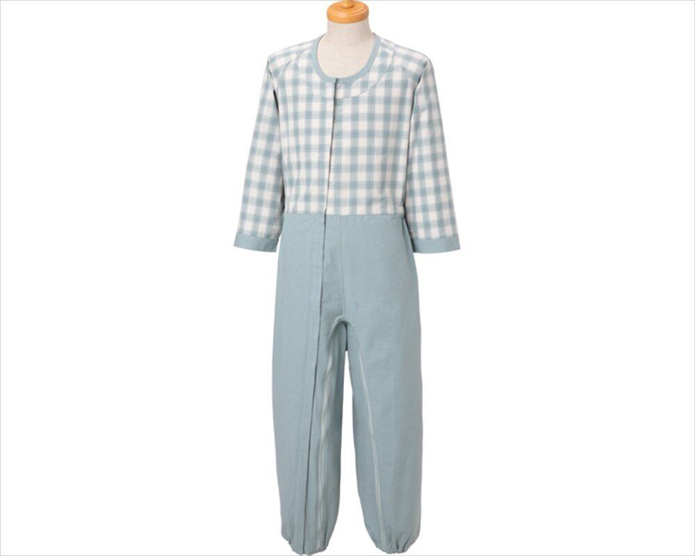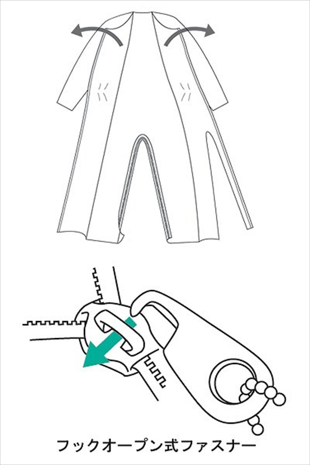 胸元から足首まで1本のファスナーで開閉できますので寝たきりの方でも無理なく着脱ができ、おむつ交換も容易に行えます。