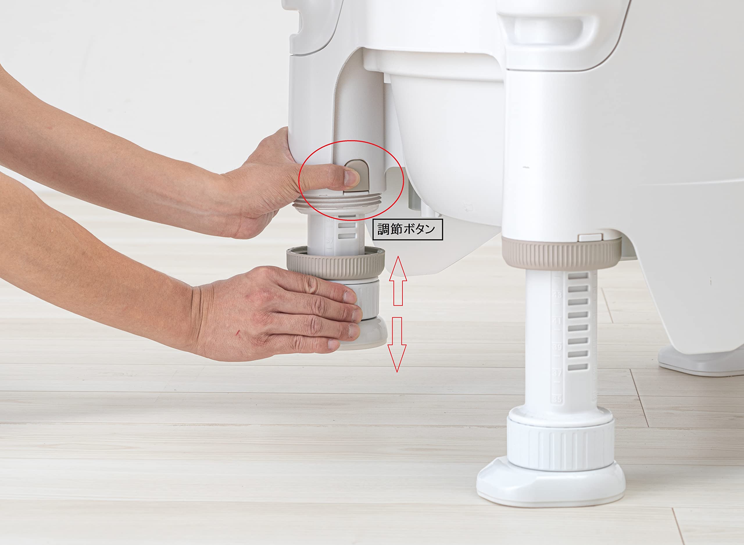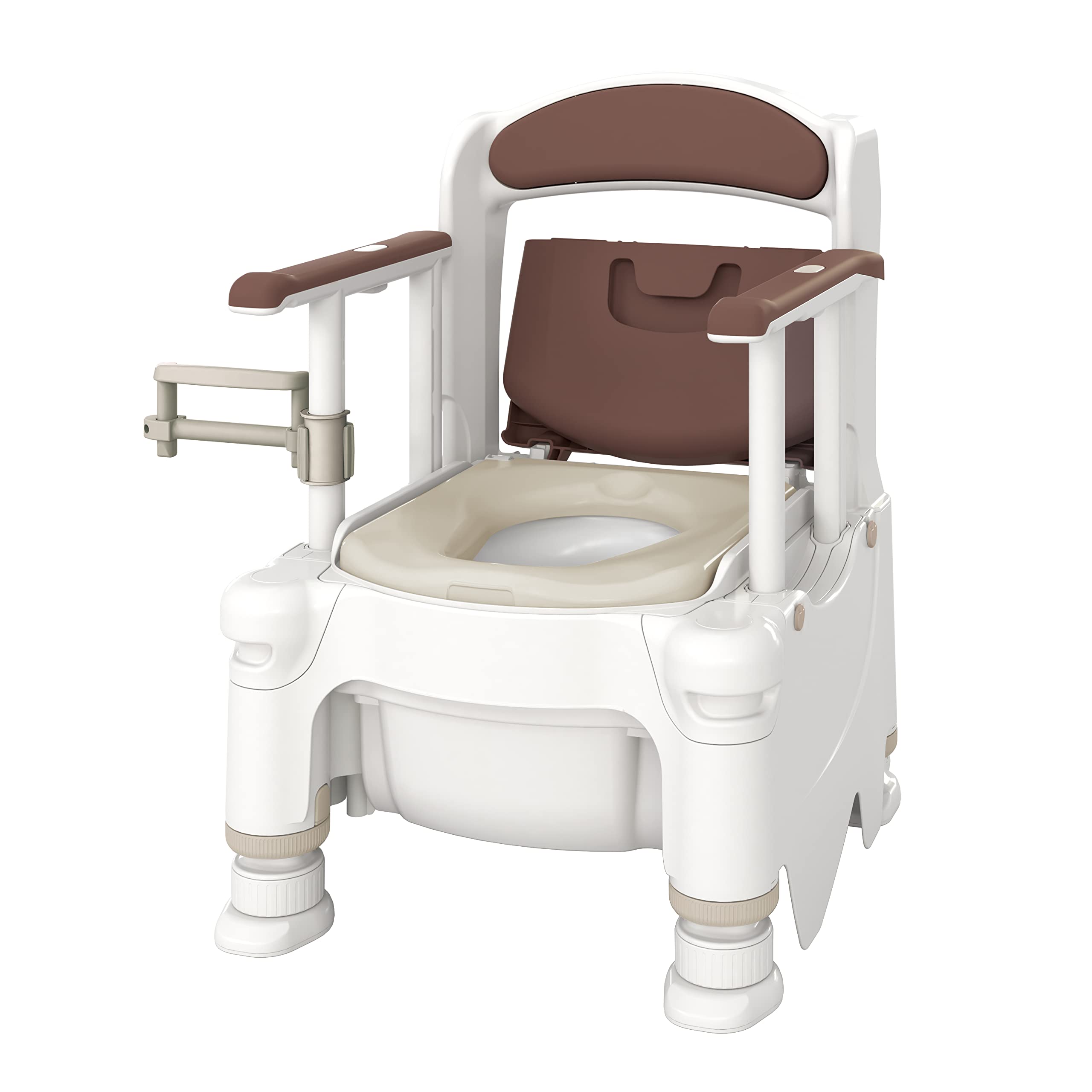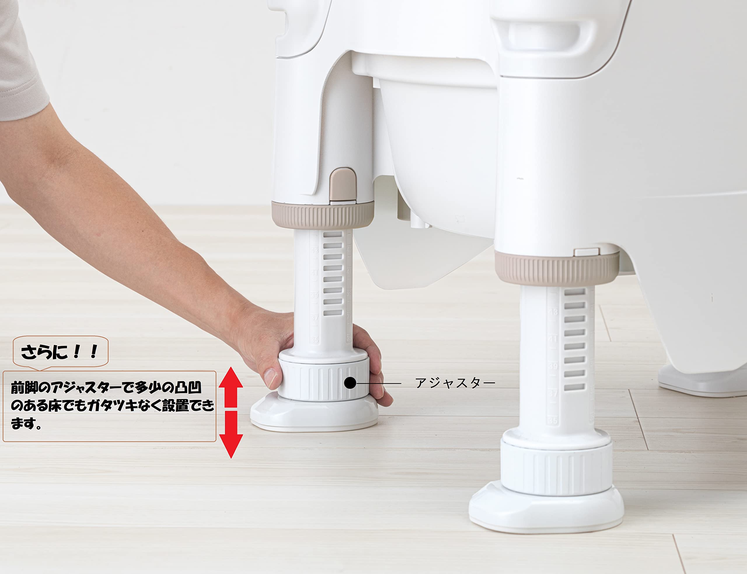 体格に合わせてワンタッチ調節:排泄姿勢や移乗動作に合わせて脚やひじ掛けを楽らく調節。